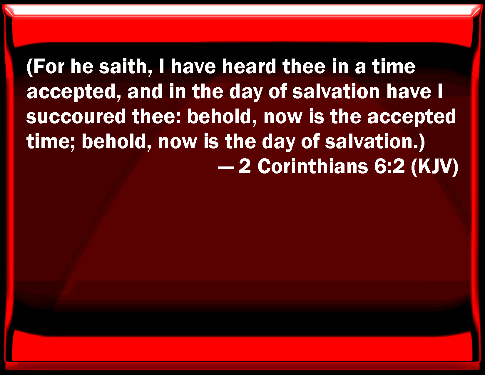 Bible Verse Slide 2 Corinthians 6:2 (For he said, I have heard you in a time accepted, and in the day of salvation have I succored you: behold, now is the accepted time; behold, now is the day of salvation.) KJV: (For he saith, I have heard thee in a time accepted, and in the day of salvation have I succoured thee: behold, now is the accepted time; behold, now is the day of salvation.) DRB: For he saith: In an accepted time have I heard thee; and in the day of salvation have I helped thee. Behold, now is the acceptable time; behold, now is the day of salvation. DBT: (for he says, I have listened to thee in an accepted time, and I have helped thee in a day of salvation: behold, now is the well-accepted time; behold, now the day of salvation:) ERV: (for he saith, At an acceptable time I hearkened unto thee, And in a day of salvation did I succour thee: behold, now is the acceptable time; behold, now is the day of salvation): WBT: (For he saith, I have heard thee in a time accepted, and in the day of salvation have I succored thee: behold, now is the accepted time; behold, now is the day of salvation.) WEB: for he says, "At an acceptable time I listened to you, in a day of salvation I helped you." Behold, now is the acceptable time. Behold, now is the day of salvation. YLT: for He saith, 'In an acceptable time I did hear thee, and in a day of salvation I did help thee, lo, now is a well-accepted time; lo, now, a day of salvation,' — Links 2 Corinthians 6:2 NIV • 2 Corinthians 6:2 NLT • 2 Corinthians 6:2 ESV • 2 Corinthians 6:2 NASB • 2 Corinthians 6:2 KJV • 2 Corinthians 6:2 Interlinear • 2 Corinthians 6:2 Commentaries • 2 Corinthians 6:2 Parallel Texts • 2 Corinthians 6:2 Bible Apps • 2 Corinthians 6:2 Parallel • Bible Hub |