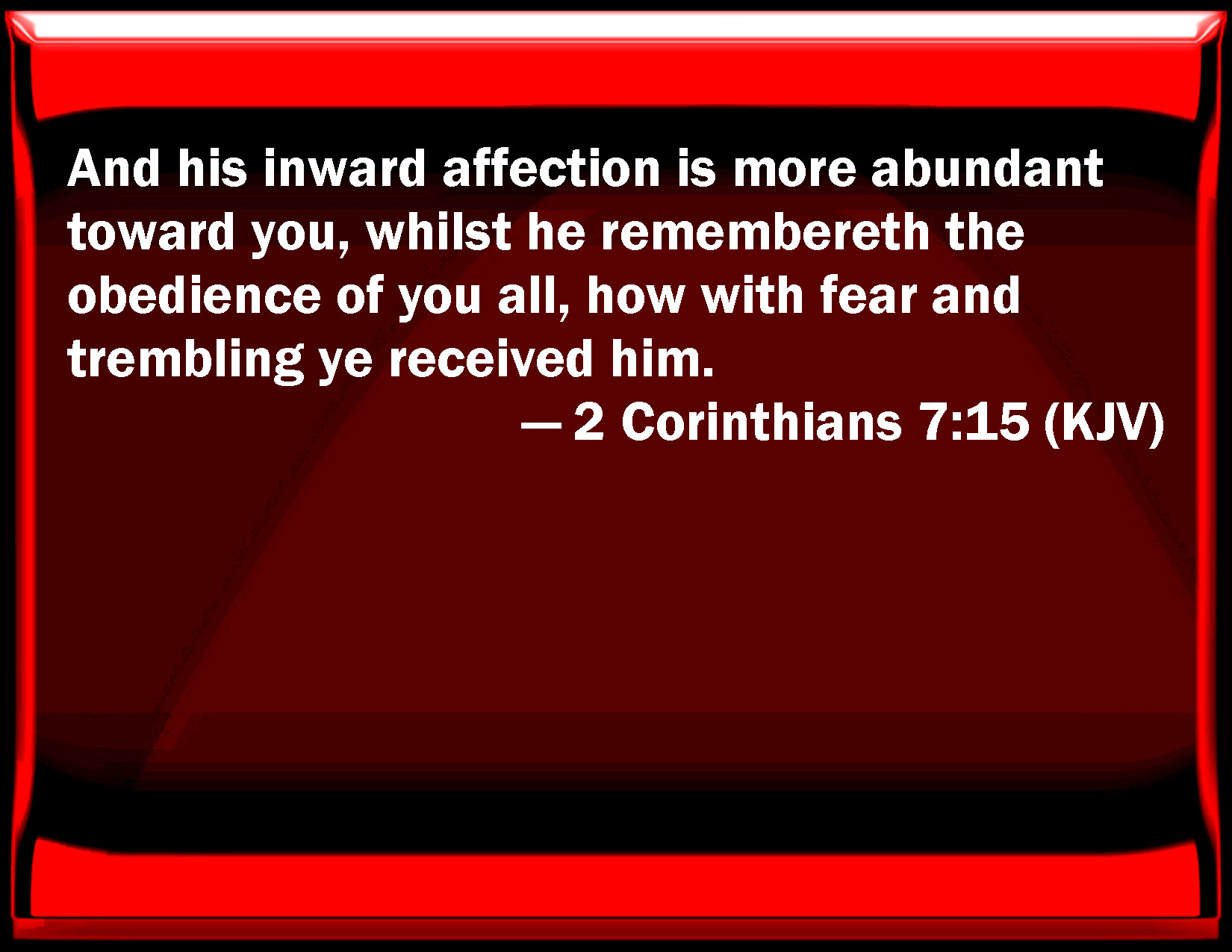 Bible Verse Slide 2 Corinthians 7:15 And his inward affection is more abundant toward you, whilst he remembers the obedience of you all, how with fear and trembling you received him. KJV: And his inward affection is more abundant toward you, whilst he remembereth the obedience of you all, how with fear and trembling ye received him. DRB: And his bowels are more abundantly towards you; remembering the obedience of you all, how with fear and trembling you have received him. DBT: and his affections are more abundantly towards you, calling to mind the obedience of you all, how with fear and trembling ye received him. ERV: And his inward affection is more abundantly toward you, whilst he remembereth the obedience of you all, how with fear and trembling ye received him. WBT: And his tender affection is more abundant towards you, whilst he remembereth the obedience of you all, how with fear and trembling ye received him. WEB: His affection is more abundantly toward you, while he remembers all of your obedience, how with fear and trembling you received him. YLT: and his tender affection is more abundantly toward you, remembering the obedience of you all, how with fear and trembling ye did receive him;Links 2 Corinthians 7:15 NIV • 2 Corinthians 7:15 NLT • 2 Corinthians 7:15 ESV • 2 Corinthians 7:15 NASB • 2 Corinthians 7:15 KJV • 2 Corinthians 7:15 Interlinear • 2 Corinthians 7:15 Commentaries • 2 Corinthians 7:15 Parallel Texts • 2 Corinthians 7:15 Bible Apps • 2 Corinthians 7:15 Parallel • Bible Hub |