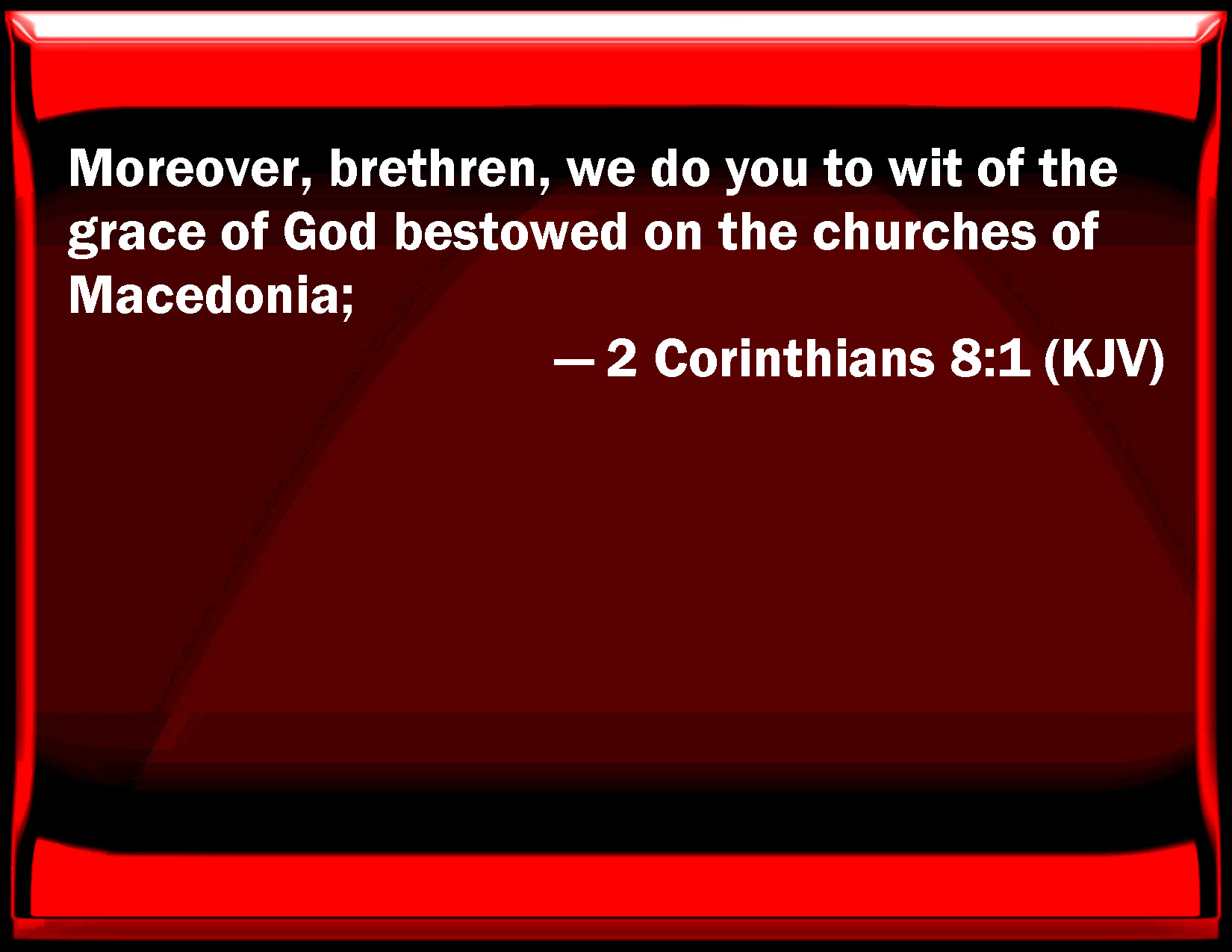 Bible Verse Slide 2 Corinthians 8:1 Moreover, brothers, we do you to wit of the grace of God bestowed on the churches of Macedonia; KJV: Moreover, brethren, we do you to wit of the grace of God bestowed on the churches of Macedonia; DRB: Now we make known unto you, brethren, the grace of God, that hath been given in the churches of Macedonia. DBT: But we make known to you, brethren, the grace of God bestowed in the assemblies of Macedonia; ERV: Moreover, brethren, we make known to you the grace of God which hath been given in the churches of Macedonia; WBT: Moreover, brethren, we make known to you the grace of God bestowed on the churches of Macedonia; WEB: Moreover, brothers, we make known to you the grace of God which has been given in the assemblies of Macedonia; YLT: And we make known to you, brethren, the grace of God, that hath been given in the assemblies of Macedonia,Links 2 Corinthians 8:1 NIV • 2 Corinthians 8:1 NLT • 2 Corinthians 8:1 ESV • 2 Corinthians 8:1 NASB • 2 Corinthians 8:1 KJV • 2 Corinthians 8:1 Interlinear • 2 Corinthians 8:1 Commentaries • 2 Corinthians 8:1 Parallel Texts • 2 Corinthians 8:1 Bible Apps • 2 Corinthians 8:1 Parallel • Bible Hub |