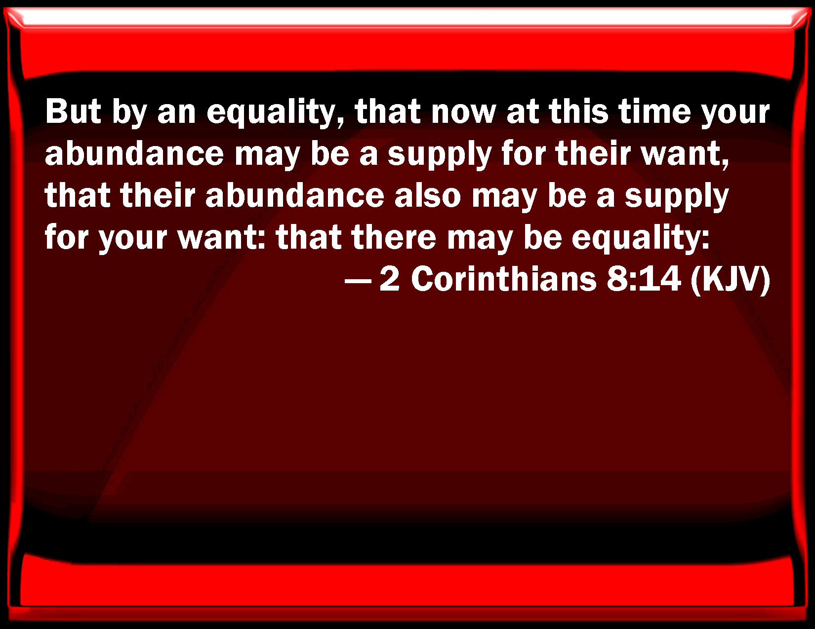 Bible Verse Slide 2 Corinthians 8:14 But by an equality, that now at this time your abundance may be a supply for their want, that their abundance also may be a supply for your want: that there may be equality: KJV: But by an equality, that now at this time your abundance may be a supply for their want, that their abundance also may be a supply for your want: that there may be equality: DRB: In this present time let your abundance supply their want, that their abundance also may supply your want, that there may be an equality, DBT: but on the principle of equality; in the present time your abundance for their lack, that their abundance may be for your lack, so that there should be equality. ERV: but by equality; your abundance being a supply at this present time for their want, that their abundance also may become a supply for your want; that there may be equality: WBT: But by an equality, that now at this time your abundance may be a supply for their want, that their abundance also may be a supply for your want: that there may be equality: WEB: but for equality. Your abundance at this present time supplies their lack, that their abundance also may become a supply for your lack; that there may be equality. YLT: but by equality, at the present time your abundance — for their want, that also their abundance may be for your want, that there may be equality,Links 2 Corinthians 8:14 NIV • 2 Corinthians 8:14 NLT • 2 Corinthians 8:14 ESV • 2 Corinthians 8:14 NASB • 2 Corinthians 8:14 KJV • 2 Corinthians 8:14 Interlinear • 2 Corinthians 8:14 Commentaries • 2 Corinthians 8:14 Parallel Texts • 2 Corinthians 8:14 Bible Apps • 2 Corinthians 8:14 Parallel • Bible Hub |