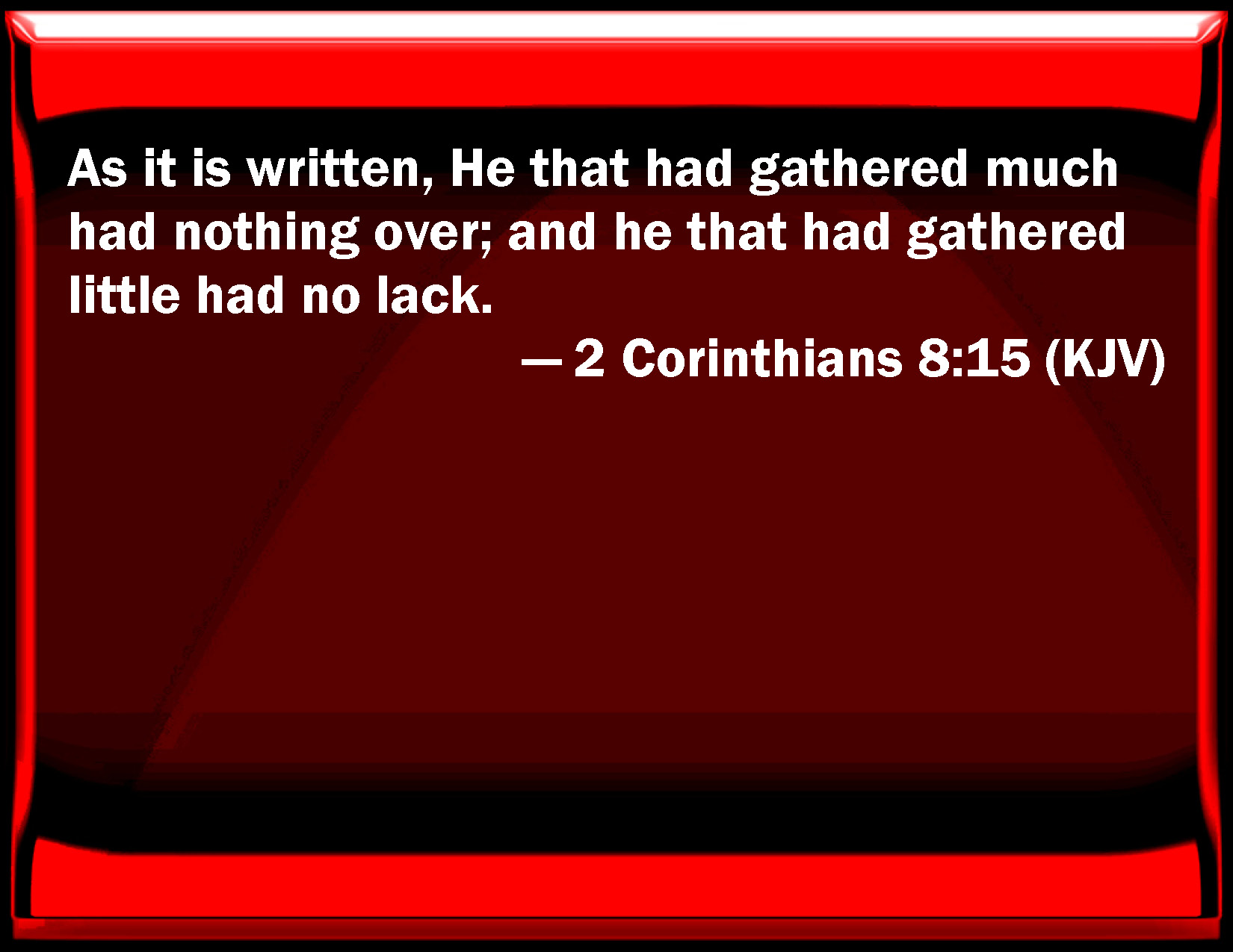 Bible Verse Slide 2 Corinthians 8:15 As it is written, He that had gathered much had nothing over; and he that had gathered little had no lack. KJV: As it is written, He that had gathered much had nothing over; and he that had gathered little had no lack. DRB: As it is written: He that had much, had nothing over; and he that had little, had no want. DBT: According as it is written, He who gathered much had no excess, and he who gathered little was nothing short. ERV: as it is written, He that gathered much had nothing over; and he that gathered little had no lack. WBT: As it is written, He that had gathered much had nothing over; and he that had gathered little had no want. WEB: As it is written, "He who gathered much had nothing left over, and he who gathered little had no lack." YLT: according as it hath been written, 'He who did gather much, had nothing over; and he who did gather little, had no lack.'Links 2 Corinthians 8:15 NIV • 2 Corinthians 8:15 NLT • 2 Corinthians 8:15 ESV • 2 Corinthians 8:15 NASB • 2 Corinthians 8:15 KJV • 2 Corinthians 8:15 Interlinear • 2 Corinthians 8:15 Commentaries • 2 Corinthians 8:15 Parallel Texts • 2 Corinthians 8:15 Bible Apps • 2 Corinthians 8:15 Parallel • Bible Hub |