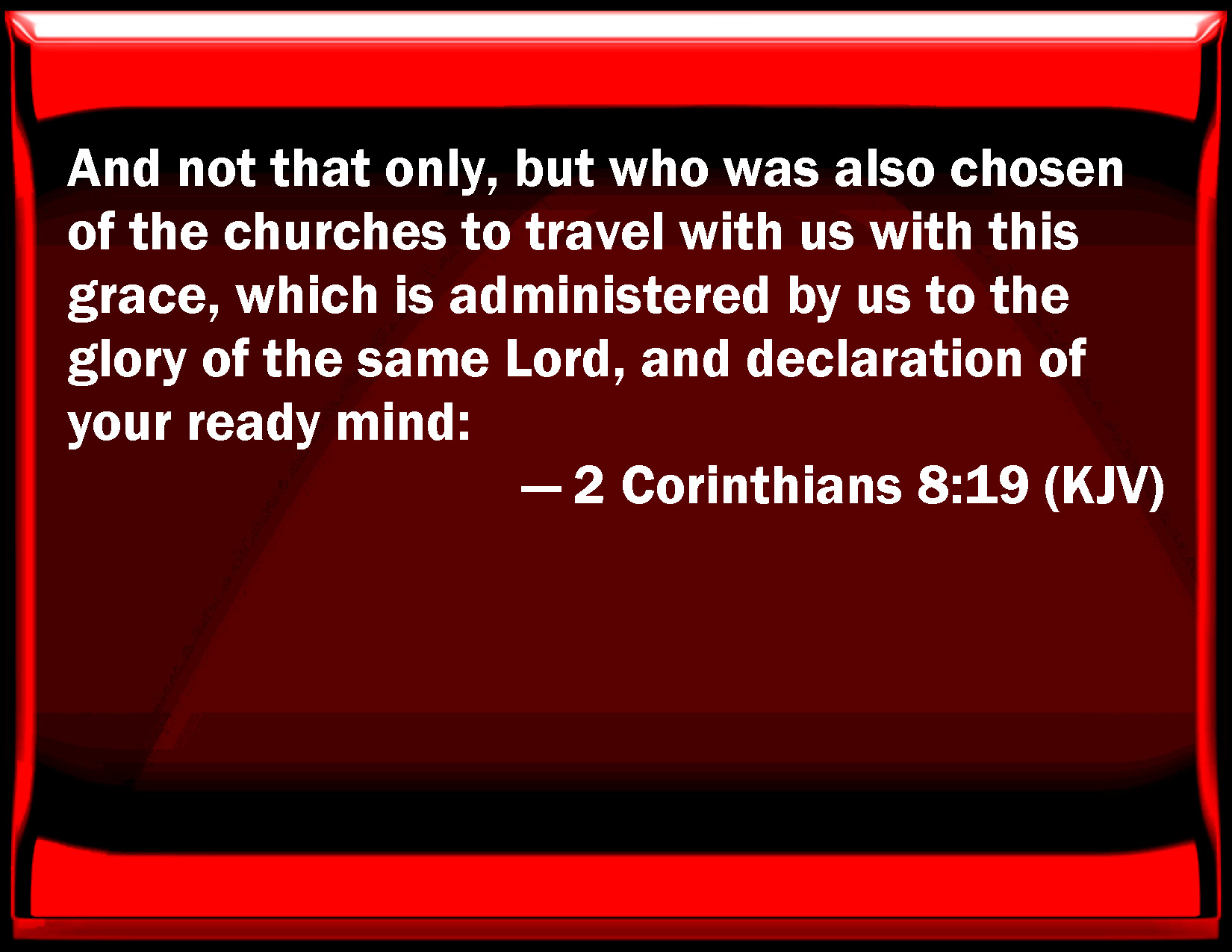 Bible Verse Slide 2 Corinthians 8:19 And not that only, but who was also chosen of the churches to travel with us with this grace, which is administered by us to the glory of the same Lord, and declaration of your ready mind: KJV: And not that only, but who was also chosen of the churches to travel with us with this grace, which is administered by us to the glory of the same Lord, and declaration of your ready mind: DRB: And not that only, but he was also ordained by the churches companion of our travels, for this grace, which is administered by us, to the glory of the Lord, and our determined will: DBT: and not only so, but is also chosen by the assemblies as our fellow-traveller with this grace, ministered by us to the glory of the Lord himself, and a witness of our readiness; ERV: and not only so, but who was also appointed by the churches to travel with us in the matter of this grace, which is ministered by us to the glory of the Lord, and to shew our readiness: WBT: And not that only, but who was also chosen by the churches to travel with us with this grace, which is administered by us to the glory of the same Lord, and declaration of your ready mind: WEB: Not only so, but who was also appointed by the assemblies to travel with us in this grace, which is served by us to the glory of the Lord himself, and to show our readiness. YLT: and not only so, but who was also appointed by vote by the assemblies, our fellow-traveller, with this favour that is ministered by us, unto the glory of the same Lord, and your willing mind;Links 2 Corinthians 8:19 NIV • 2 Corinthians 8:19 NLT • 2 Corinthians 8:19 ESV • 2 Corinthians 8:19 NASB • 2 Corinthians 8:19 KJV • 2 Corinthians 8:19 Interlinear • 2 Corinthians 8:19 Commentaries • 2 Corinthians 8:19 Parallel Texts • 2 Corinthians 8:19 Bible Apps • 2 Corinthians 8:19 Parallel • Bible Hub |