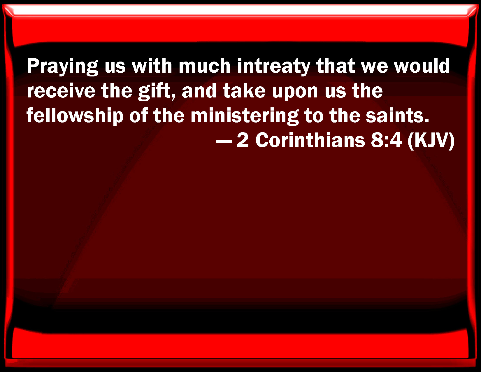 2 Corinthians 8:4 Praying us with much entreaty that we would receive the gift, and take on us the fellowship of the ministering to the saints.