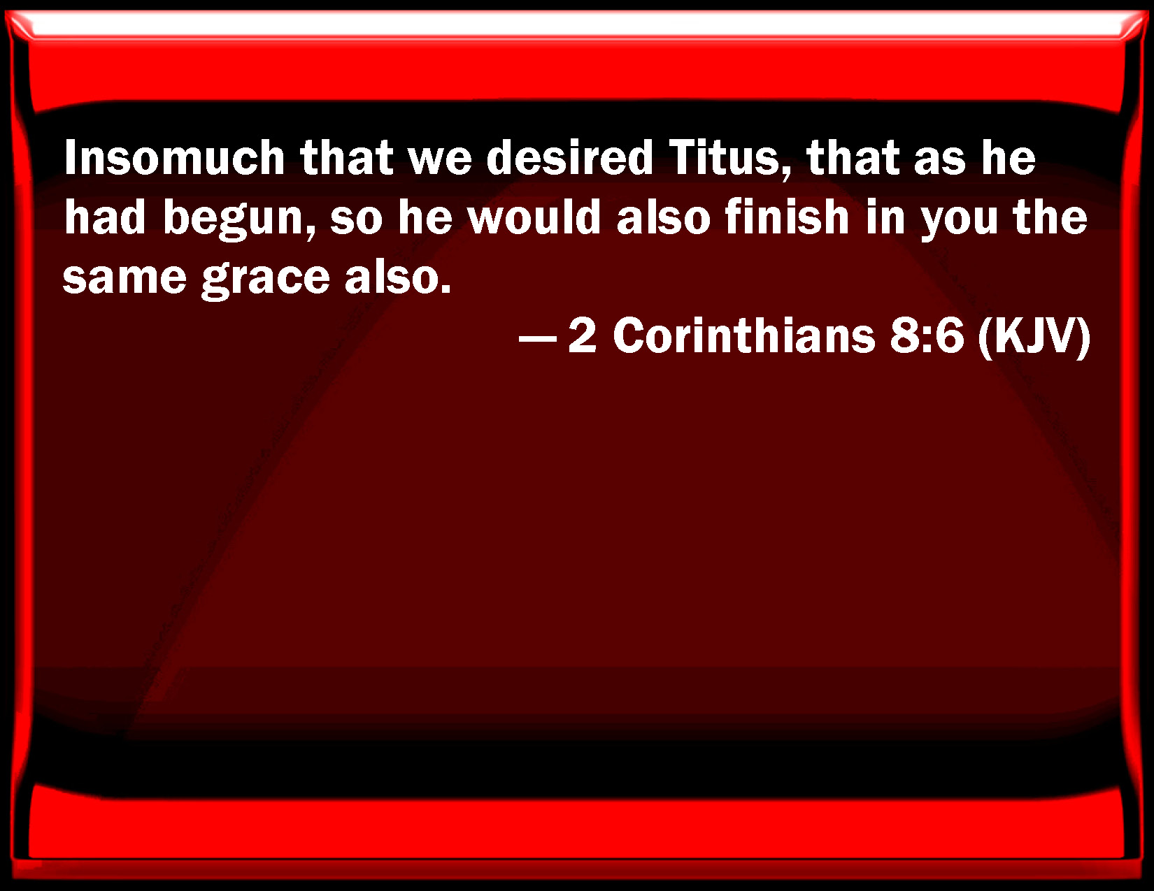 Bible Verse Slide 2 Corinthians 8:6 So that we desired Titus, that as he had begun, so he would also finish in you the same grace also. KJV: Insomuch that we desired Titus, that as he had begun, so he would also finish in you the same grace also. DRB: Insomuch, that we desired Titus, that as he had begun, so also he would finish among you this same grace. DBT: So that we begged Titus that, according as he had before begun, so he would also complete as to you this grace also; ERV: Insomuch that we exhorted Titus, that as he had made a beginning before, so he would also complete in you this grace also. WBT: So that we desired Titus, that as he had begun, so he would also finish in you the same grace also. WEB: So we urged Titus, that as he made a beginning before, so he would also complete in you this grace. YLT: so that we exhorted Titus, that, according as he did begin before, so also he may finish to you also this favour,Links 2 Corinthians 8:6 NIV • 2 Corinthians 8:6 NLT • 2 Corinthians 8:6 ESV • 2 Corinthians 8:6 NASB • 2 Corinthians 8:6 KJV • 2 Corinthians 8:6 Interlinear • 2 Corinthians 8:6 Commentaries • 2 Corinthians 8:6 Parallel Texts • 2 Corinthians 8:6 Bible Apps • 2 Corinthians 8:6 Parallel • Bible Hub |