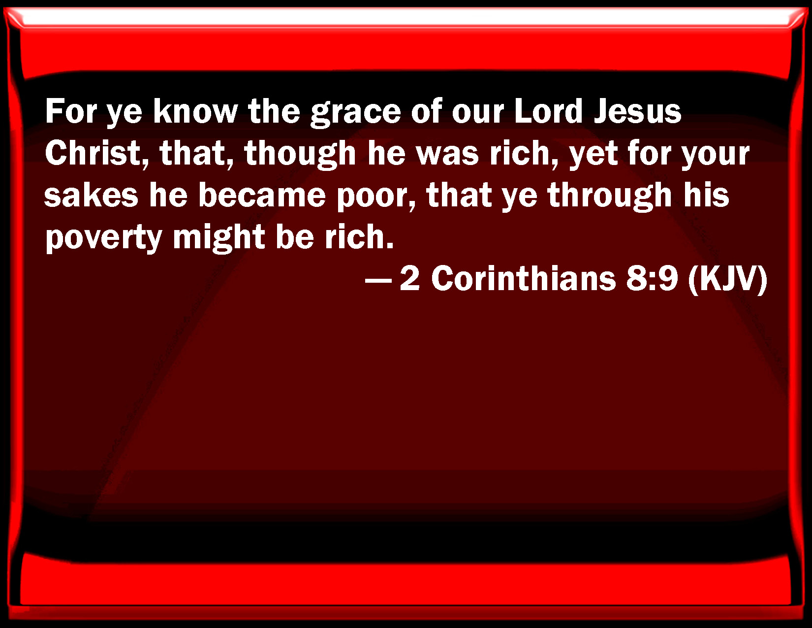 Bible Verse Slide 2 Corinthians 8:9 For you know the grace of our Lord Jesus Christ, that, though he was rich, yet for your sakes he became poor, that you through his poverty might be rich. KJV: For ye know the grace of our Lord Jesus Christ, that, though he was rich, yet for your sakes he became poor, that ye through his poverty might be rich. DRB: For you know the grace of our Lord Jesus Christ, that being rich he became poor, for your sakes; that through his poverty you might be rich. DBT: For ye know the grace of our Lord Jesus Christ, that for your sakes he, being rich, became poor, in order that ye by his poverty might be enriched. ERV: For ye know the grace of our Lord Jesus Christ, that, though he was rich, yet for your sakes he became poor, that ye through his poverty might become rich. WBT: For ye know the grace of our Lord Jesus Christ, that though he was rich, yet for your sakes he became poor, that ye through his poverty might be rich. WEB: For you know the grace of our Lord Jesus Christ, that, though he was rich, yet for your sakes he became poor, that you through his poverty might become rich. YLT: for ye know the grace of our Lord Jesus Christ, that because of you he became poor — being rich, that ye by that poverty may become rich.Links 2 Corinthians 8:9 NIV • 2 Corinthians 8:9 NLT • 2 Corinthians 8:9 ESV • 2 Corinthians 8:9 NASB • 2 Corinthians 8:9 KJV • 2 Corinthians 8:9 Interlinear • 2 Corinthians 8:9 Commentaries • 2 Corinthians 8:9 Parallel Texts • 2 Corinthians 8:9 Bible Apps • 2 Corinthians 8:9 Parallel • Bible Hub |