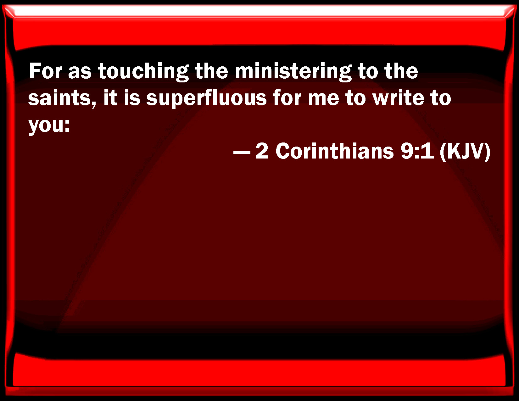 Bible Verse Slide 2 Corinthians 9:1 For as touching the ministering to the saints, it is superfluous for me to write to you: KJV: For as touching the ministering to the saints, it is superfluous for me to write to you: DRB: For concerning the ministry that is done towards the saints, it is superfluous for me to write unto you. DBT: For concerning the ministration which is for the saints, it is superfluous my writing to you. ERV: For as touching the ministering to the saints, it is superfluous for me to write to you: WBT: For as concerning the ministering to the saints, it is superfluous for me to write to you: WEB: It is indeed unnecessary for me to write to you concerning the service to the saints, YLT: For, indeed, concerning the ministration that is for the saints, it is superfluous for me to write to you,Links 2 Corinthians 9:1 NIV • 2 Corinthians 9:1 NLT • 2 Corinthians 9:1 ESV • 2 Corinthians 9:1 NASB • 2 Corinthians 9:1 KJV • 2 Corinthians 9:1 Interlinear • 2 Corinthians 9:1 Commentaries • 2 Corinthians 9:1 Parallel Texts • 2 Corinthians 9:1 Bible Apps • 2 Corinthians 9:1 Parallel • Bible Hub |