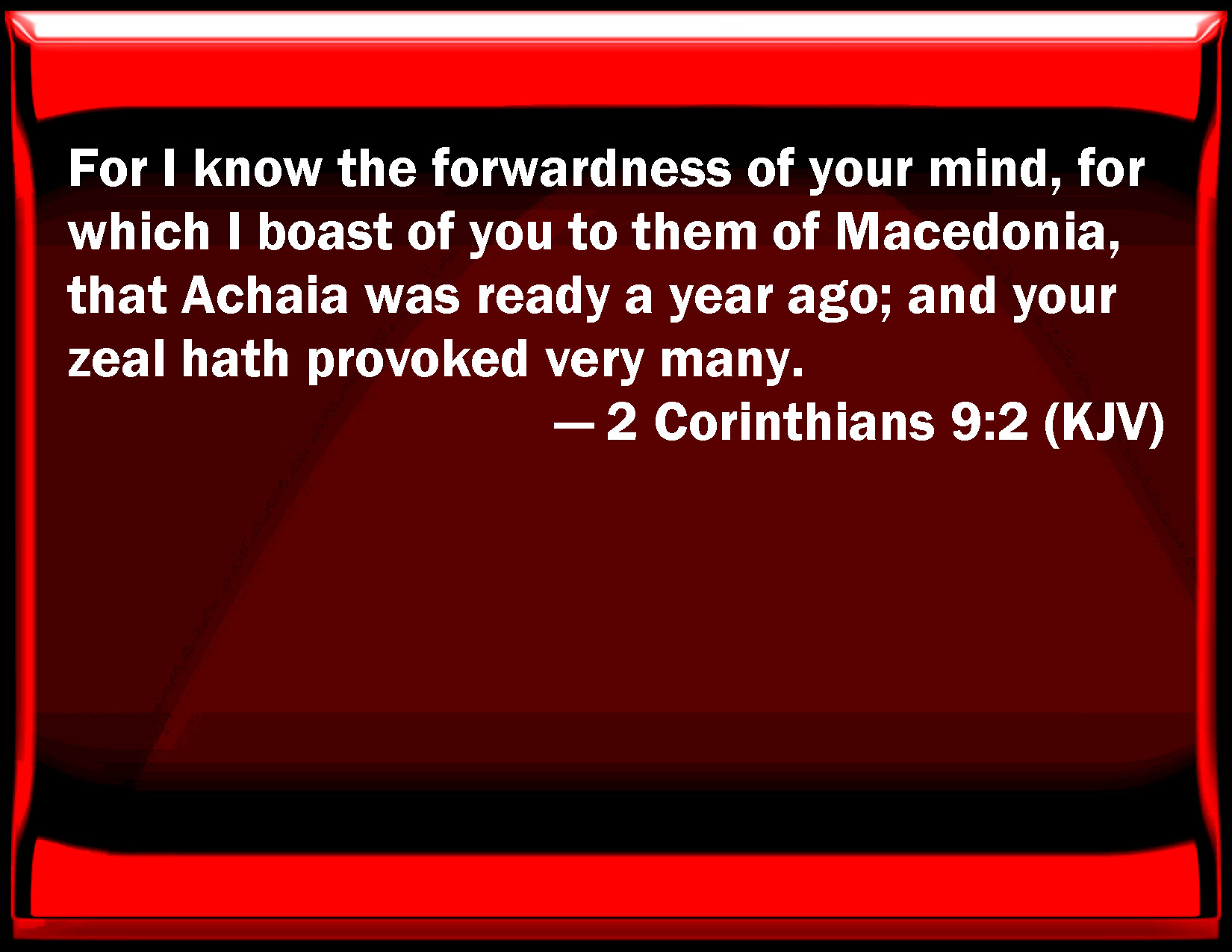 Bible Verse Slide 2 Corinthians 9:2 For I know the forwardness of your mind, for which I boast of you to them of Macedonia, that Achaia was ready a year ago; and your zeal has provoked very many. KJV: For I know the forwardness of your mind, for which I boast of you to them of Macedonia, that Achaia was ready a year ago; and your zeal hath provoked very many. DRB: For I know your forward mind: for which I boast of you to the Macedonians. That Achaia also is ready from the year past, and your emulation hath provoked very many. DBT: For I know your readiness, which I boast of as respects you to Macedonians, that Achaia is prepared since a year ago, and the zeal reported of you has stimulated the mass of the brethren. ERV: for I know your readiness, of which I glory on your behalf to them of Macedonia, that Achaia hath been prepared for a year past; and your zeal hath stirred up very many of them. WBT: For I know the forwardness of your mind, for which I boast of you to them of Macedonia, that Achaia was ready a year ago; and your zeal hath incited very many. WEB: for I know your readiness, of which I boast on your behalf to them of Macedonia, that Achaia has been prepared for a year past. Your zeal has stirred up very many of them. YLT: for I have known your readiness of mind, which in your behalf I boast of to Macedonians, that Achaia hath been prepared a year ago, and the zeal of you did stir up the more part,Links 2 Corinthians 9:2 NIV • 2 Corinthians 9:2 NLT • 2 Corinthians 9:2 ESV • 2 Corinthians 9:2 NASB • 2 Corinthians 9:2 KJV • 2 Corinthians 9:2 Interlinear • 2 Corinthians 9:2 Commentaries • 2 Corinthians 9:2 Parallel Texts • 2 Corinthians 9:2 Bible Apps • 2 Corinthians 9:2 Parallel • Bible Hub |