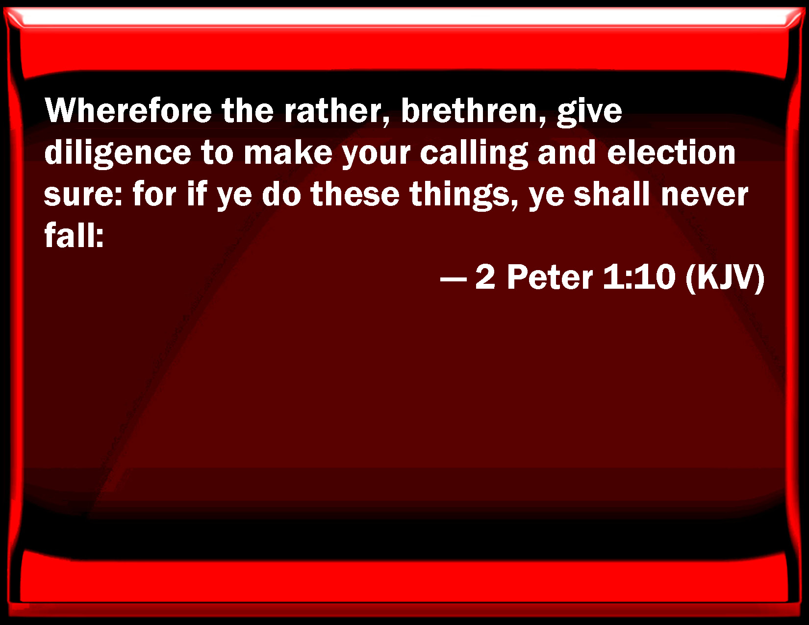 Bible Verse Slide 2 Peter 1:10 Why the rather, brothers, give diligence to make your calling and election sure: for if you do these things, you shall never fall: KJV: Wherefore the rather, brethren, give diligence to make your calling and election sure: for if ye do these things, ye shall never fall: DRB: Wherefore, brethren, labour the more, that by good works you may make sure your calling and election. For doing these things, you shall not sin at any time. DBT: Wherefore the rather, brethren, use diligence to make your calling and election sure, for doing these things ye will never fall; ERV: Wherefore, brethren, give the more diligence to make your calling and election sure: for if ye do these things, ye shall never stumble: WBT: Wherefore the rather, brethren, give diligence to make your calling and election sure: for if ye do these things, ye shall never fall: WEB: Therefore, brothers, be more diligent to make your calling and election sure. For if you do these things, you will never stumble. YLT: wherefore, the rather, brethren, be diligent to make stedfast your calling and choice, for these things doing, ye may never stumble,Links 2 Peter 1:10 NIV • 2 Peter 1:10 NLT • 2 Peter 1:10 ESV • 2 Peter 1:10 NASB • 2 Peter 1:10 KJV • 2 Peter 1:10 Interlinear • 2 Peter 1:10 Commentaries • 2 Peter 1:10 Parallel Texts • 2 Peter 1:10 Bible Apps • 2 Peter 1:10 Parallel • Bible Hub |