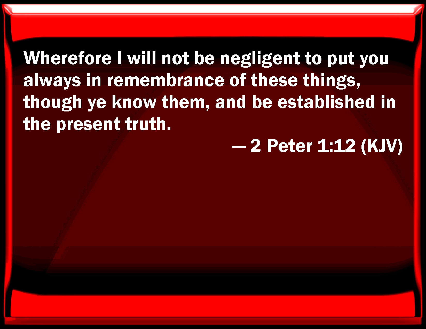 Bible Verse Slide 2 Peter 1:12 Why I will not be negligent to put you always in remembrance of these things, though you know them, and be established in the present truth. KJV: Wherefore I will not be negligent to put you always in remembrance of these things, though ye know them, and be established in the present truth. DRB: For which cause I will begin to put you always in remembrance of these things: though indeed you know them, and are confirmed in the present truth. DBT: Wherefore I will be careful to put you always in mind of these things, although knowing them and established in the present truth. ERV: Wherefore I shall be ready always to put you in remembrance of these things, though ye know them, and are established in the truth which is with you. WBT: Wherefore I will not be negligent to put you always in remembrance of these things, though ye know them, and are established in the present truth. WEB: Therefore I will not be negligent to remind you of these things, though you know them, and are established in the present truth. YLT: Wherefore, I will not be careless always to remind you concerning these things, though, having known them, and having been established in the present truth,Links 2 Peter 1:12 NIV • 2 Peter 1:12 NLT • 2 Peter 1:12 ESV • 2 Peter 1:12 NASB • 2 Peter 1:12 KJV • 2 Peter 1:12 Interlinear • 2 Peter 1:12 Commentaries • 2 Peter 1:12 Parallel Texts • 2 Peter 1:12 Bible Apps • 2 Peter 1:12 Parallel • Bible Hub |