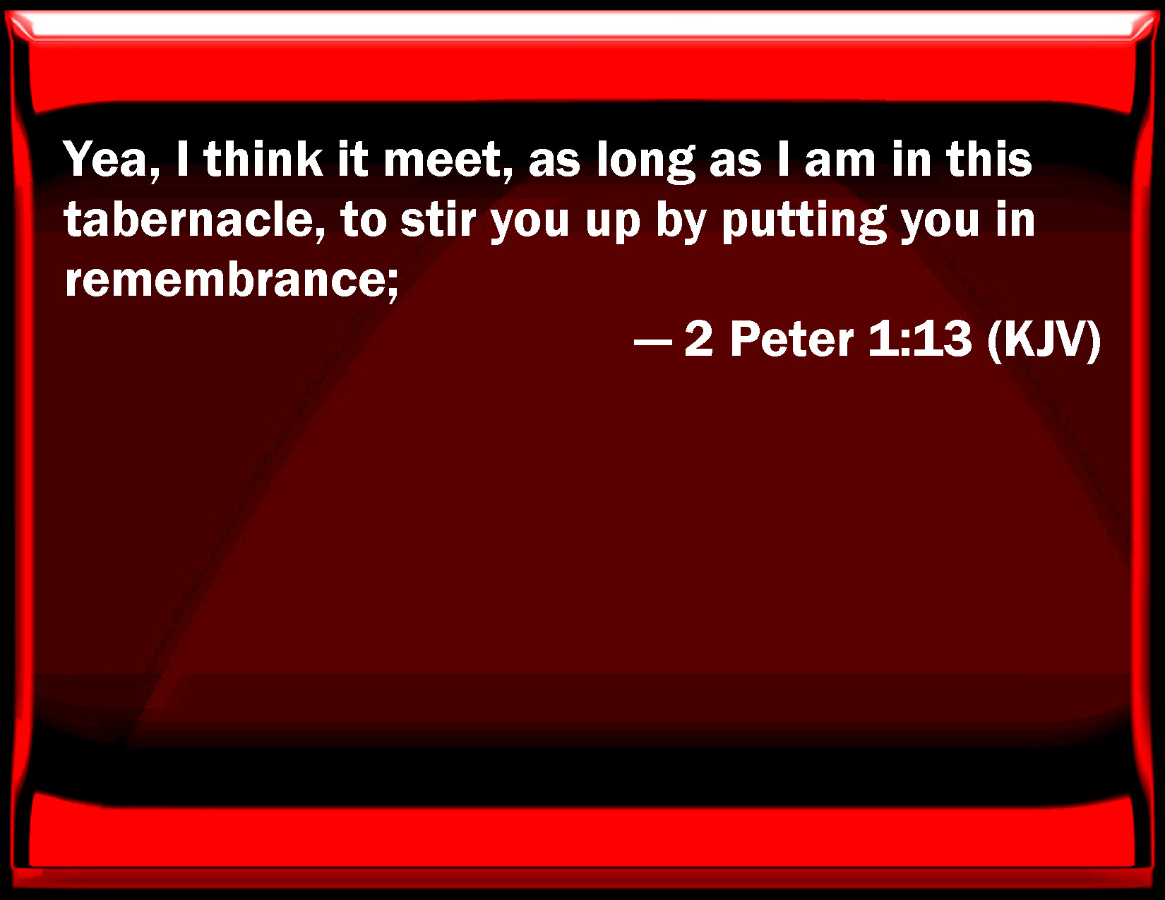 Bible Verse Slide 2 Peter 1:13 Yes, I think it meet, as long as I am in this tabernacle, to stir you up by putting you in remembrance; KJV: Yea, I think it meet, as long as I am in this tabernacle, to stir you up by putting you in remembrance; DRB: But I think it meet as long as I am in this tabernacle, to stir you up by putting you in remembrance. DBT: But I account it right, as long as I am in this tabernacle, to stir you up by putting you in remembrance, ERV: And I think it right, as long as I am in this tabernacle, to stir you up by putting you in remembrance; WBT: Indeed, I think it meet, as long as I am in this tabernacle, to stir you up by putting you in remembrance; WEB: I think it right, as long as I am in this tent, to stir you up by reminding you; YLT: and I think right, so long as I am in this tabernacle, to stir you up in reminding you,Links 2 Peter 1:13 NIV • 2 Peter 1:13 NLT • 2 Peter 1:13 ESV • 2 Peter 1:13 NASB • 2 Peter 1:13 KJV • 2 Peter 1:13 Interlinear • 2 Peter 1:13 Commentaries • 2 Peter 1:13 Parallel Texts • 2 Peter 1:13 Bible Apps • 2 Peter 1:13 Parallel • Bible Hub |