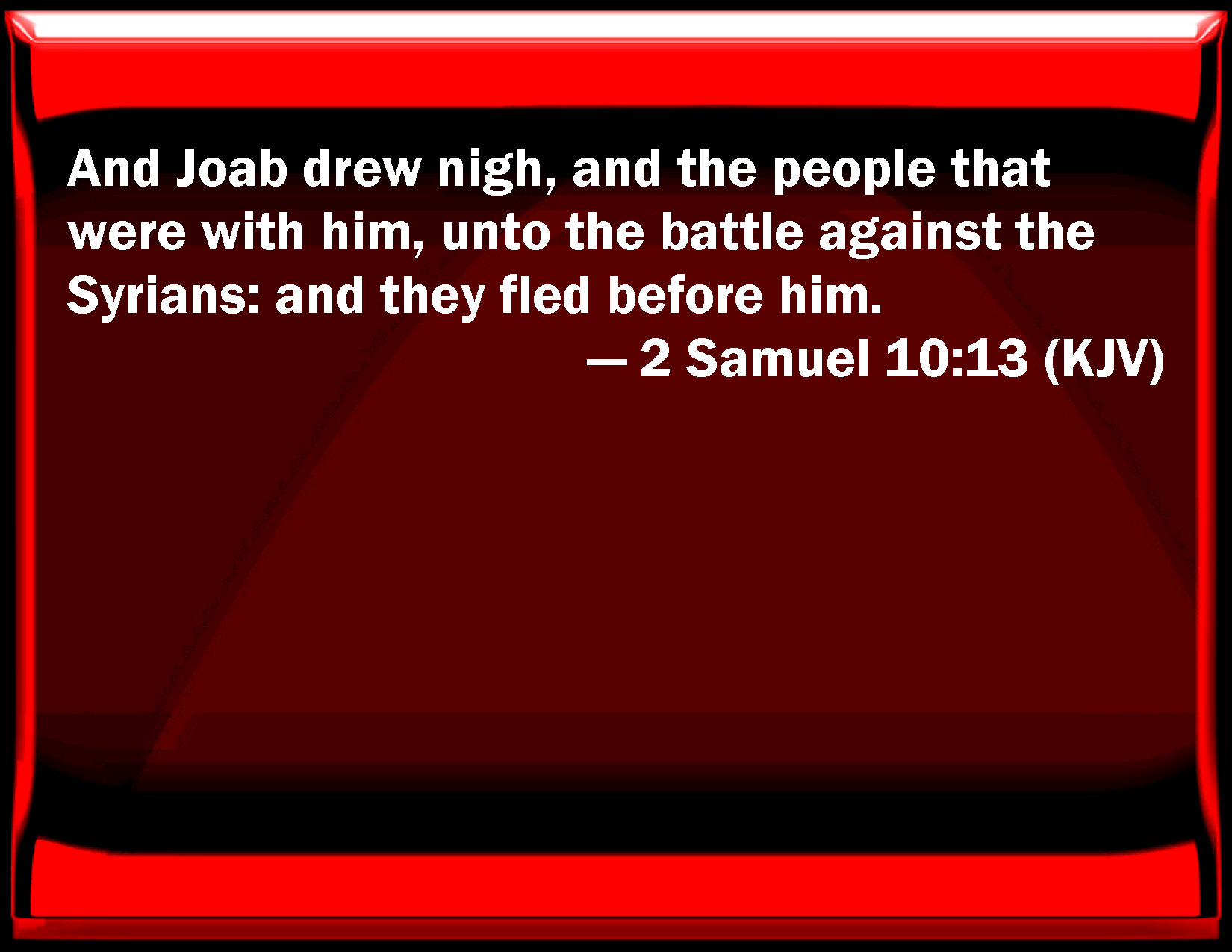 Bible Verse Slide 2 Samuel 10:13 And Joab drew near, and the people that were with him, to the battle against the Syrians: and they fled before him. KJV: And Joab drew nigh, and the people that were with him, unto the battle against the Syrians: and they fled before him. DRB: And Joab and the people that were with him, began to fight against the Syrians: and they immediately fled before him. DBT: And Joab drew near, and the people that were with him, unto the battle against the Syrians; and they fled before him. ERV: So Joab and the people that were with him drew nigh unto the battle against the Syrians: and they fled before him. WBT: And Joab and the people that were with him drew near to the battle against the Syrians: and they fled before him. WEB: So Joab and the people who were with him drew near to the battle against the Syrians: and they fled before him. YLT: And Joab draweth nigh, and the people who are with him, to battle against Aram, and they flee from his presence;Links 2 Samuel 10:13 NIV • 2 Samuel 10:13 NLT • 2 Samuel 10:13 ESV • 2 Samuel 10:13 NASB • 2 Samuel 10:13 KJV • 2 Samuel 10:13 Interlinear • 2 Samuel 10:13 Commentaries • 2 Samuel 10:13 Parallel Texts • 2 Samuel 10:13 Bible Apps • 2 Samuel 10:13 Parallel • Bible Hub |