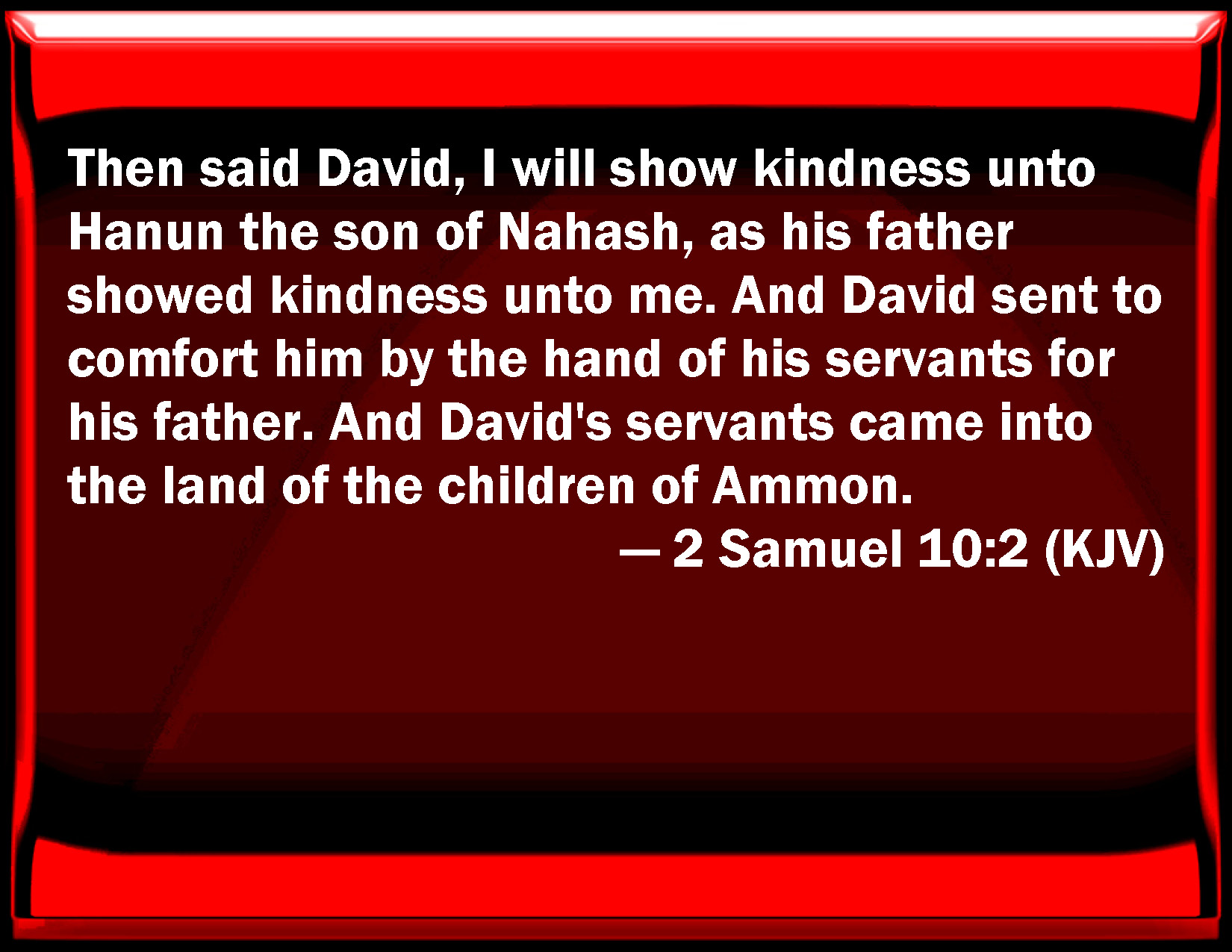 Then said David, I will show kindness to Hanun the son of Nahash, as his father showed kindness to me. And David sent to comfort him by the hand of his servants for his father. And David's servants came into the land of the children of Ammon.