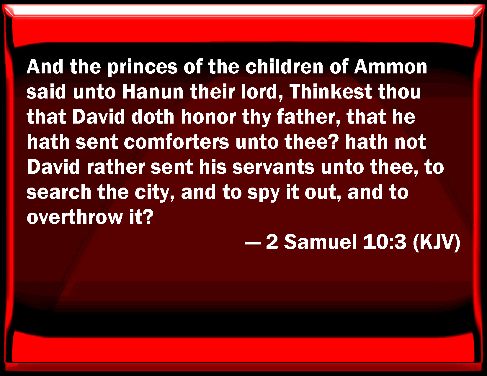Bible Verse Slide 2 Samuel 10:3 And the princes of the children of Ammon said to Hanun their lord, Think you that David does honor your father, that he has sent comforters to you? has not David rather sent his servants to you, to search the city, and to spy it out, and to overthrow it? KJV: And the princes of the children of Ammon said unto Hanun their lord, Thinkest thou that David doth honour thy father, that he hath sent comforters unto thee? hath not David rather sent his servants unto thee, to search the city, and to spy it out, and to overthrow it? DRB: The princes of the children of Ammon said to Hanon their lord: Thinkest thou that for the honour of thy father, David hath sent comforters to thee, and hath not David rather sent his servants to thee to search, and spy into the city, and overthrow it? DBT: And the princes of the children of Ammon said to Hanun their lord, Is it, in thine eyes, to honour thy father that David has sent comforters to thee? Is it not to search the city and to spy it out, and to overthrow it, that David has sent his servants to thee? ERV: But the princes of the children of Ammon said unto Hanun their lord, Thinkest thou that David doth honour thy father, that he hath sent comforters unto thee? hath not David sent his servants unto thee to search the city, and to spy it out, and to overthrow it? WBT: And the princes of the children of Ammon said to Hanun their lord, Thinkest thou that David doth honor thy father, that he hath sent comforters to thee? hath not David rather sent his servants to thee, to search the city, and to spy it out, and to overthrow it? WEB: But the princes of the children of Ammon said to Hanun their lord, "Do you think that David honors your father, in that he has sent comforters to you? Hasn't David sent his servants to you to search the city, and to spy it out, and to overthrow it?" YLT: And the heads of the Bene-Ammon say unto Hanun their lord, 'Is David honouring thy father in thine eyes because he hath sent to thee comforters? for to search the city, and to spy it, and to overthrow it, hath not David sent his servants unto thee?'Links 2 Samuel 10:3 NIV • 2 Samuel 10:3 NLT • 2 Samuel 10:3 ESV • 2 Samuel 10:3 NASB • 2 Samuel 10:3 KJV • 2 Samuel 10:3 Interlinear • 2 Samuel 10:3 Commentaries • 2 Samuel 10:3 Parallel Texts • 2 Samuel 10:3 Bible Apps • 2 Samuel 10:3 Parallel • Bible Hub |