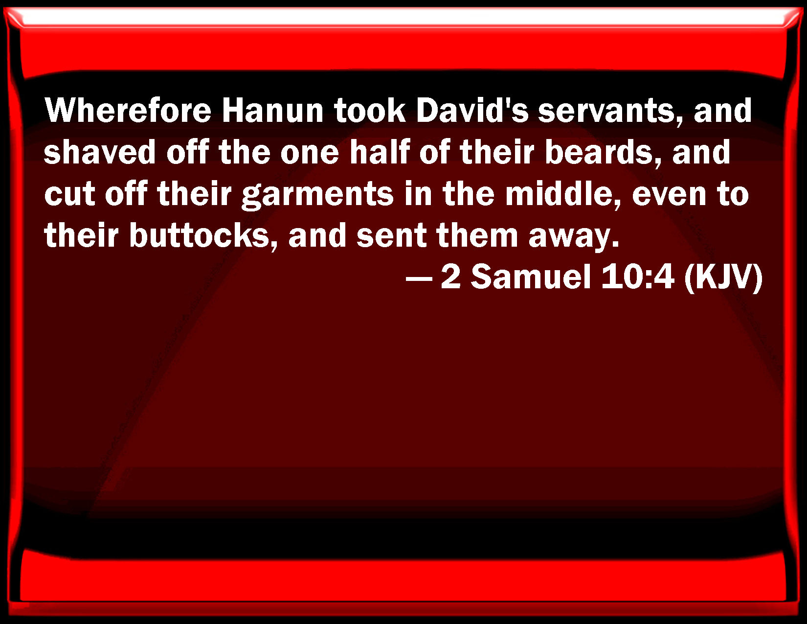 Bible Verse Slide 2 Samuel 10:4 Why Hanun took David's servants, and shaved off the one half of their beards, and cut off their garments in the middle, even to their buttocks, and sent them away. KJV: Wherefore Hanun took David's servants, and shaved off the one half of their beards, and cut off their garments in the middle, even to their buttocks, and sent them away. DRB: Wherefore Hanon took the servants of David, and shaved off the one half of their beards, and cut away half of their garments even to the buttocks, and sent them away. DBT: And Hanun took David's servants, and had the one half of their beards shaved off, and their raiment cut off in the midst, as far as their buttocks, and sent them away. ERV: So Hanun took David's servants, and shaved off the one half of their beards, and cut off their garments in the middle, even to their buttocks, and sent them away. WBT: Wherefore Hanun took David's servants, and shaved off the one half of their beards, and cut off their garments in the middle, even to their buttocks, and sent them away. WEB: So Hanun took David's servants, and shaved off the one half of their beards, and cut off their garments in the middle, even to their buttocks, and sent them away. YLT: And Hanun taketh the servants of David, and shaveth off the half of their beard, and cutteth off their long robes in the midst — unto their buttocks, and sendeth them away;Links 2 Samuel 10:4 NIV • 2 Samuel 10:4 NLT • 2 Samuel 10:4 ESV • 2 Samuel 10:4 NASB • 2 Samuel 10:4 KJV • 2 Samuel 10:4 Interlinear • 2 Samuel 10:4 Commentaries • 2 Samuel 10:4 Parallel Texts • 2 Samuel 10:4 Bible Apps • 2 Samuel 10:4 Parallel • Bible Hub |