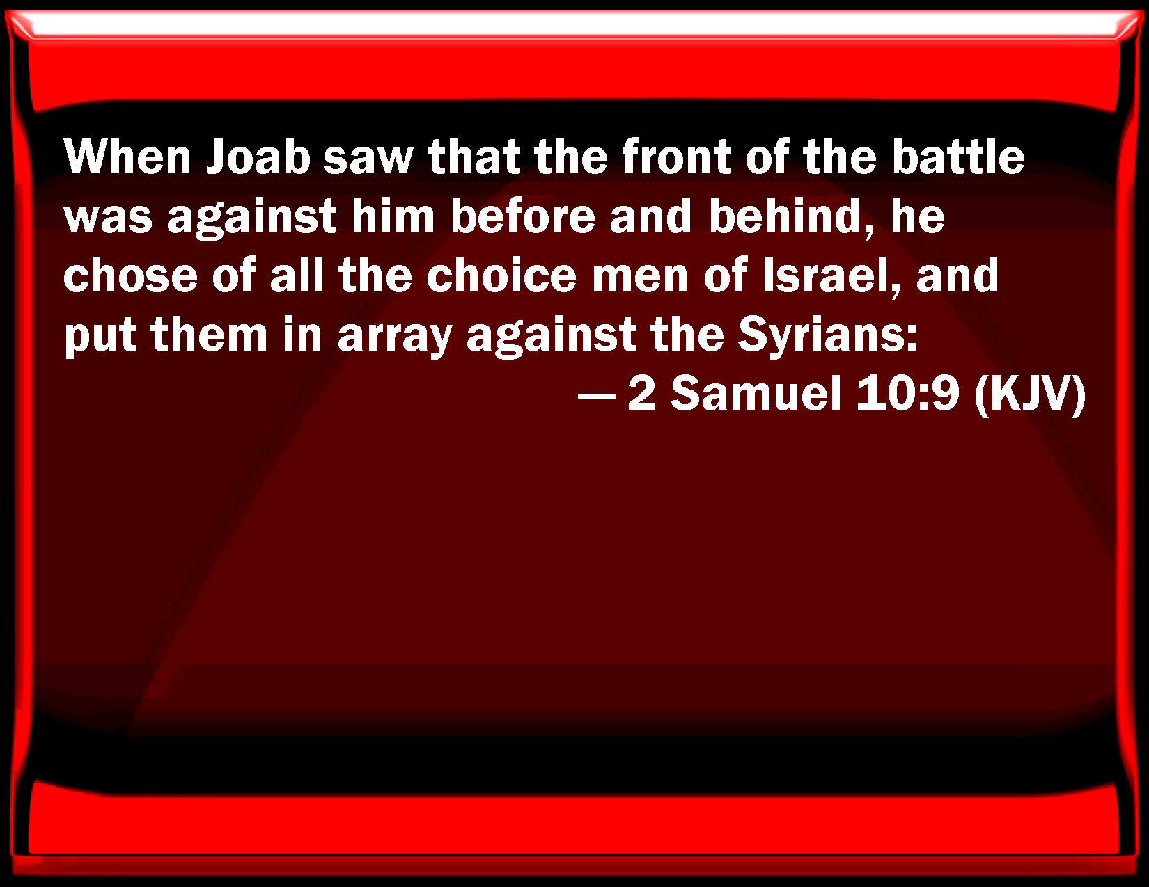 Bible Verse Slide 2 Samuel 10:9 When Joab saw that the front of the battle was against him before and behind, he chose of all the choice men of Israel, and put them in array against the Syrians: KJV: When Joab saw that the front of the battle was against him before and behind, he chose of all the choice men of Israel, and put them in array against the Syrians: DRB: Then Joab seeing that the battle was prepared against him, both before and behind, chose of all the choice men of Israel, and put them in array against the Syrians: DBT: And Joab saw that the front of the battle was against him before and behind; and he chose out of all the choice men of Israel, and put them in array against the Syrians; ERV: Now when Joab saw that the battle was set against him before and behind, he chose of all the choice men of Israel, and put them in array against the Syrians: WBT: When Joab saw that the front of the battle was against him before and behind, he selected of all the choice men of Israel, and put them in array against the Syrians: WEB: Now when Joab saw that the battle was set against him before and behind, he chose of all the choice men of Israel, and put them in array against the Syrians: YLT: and Joab seeth that the front of the battle hath been unto him before and behind, and he chooseth of all the chosen in Israel, and setteth in array to meet Aram,Links 2 Samuel 10:9 NIV • 2 Samuel 10:9 NLT • 2 Samuel 10:9 ESV • 2 Samuel 10:9 NASB • 2 Samuel 10:9 KJV • 2 Samuel 10:9 Interlinear • 2 Samuel 10:9 Commentaries • 2 Samuel 10:9 Parallel Texts • 2 Samuel 10:9 Bible Apps • 2 Samuel 10:9 Parallel • Bible Hub |