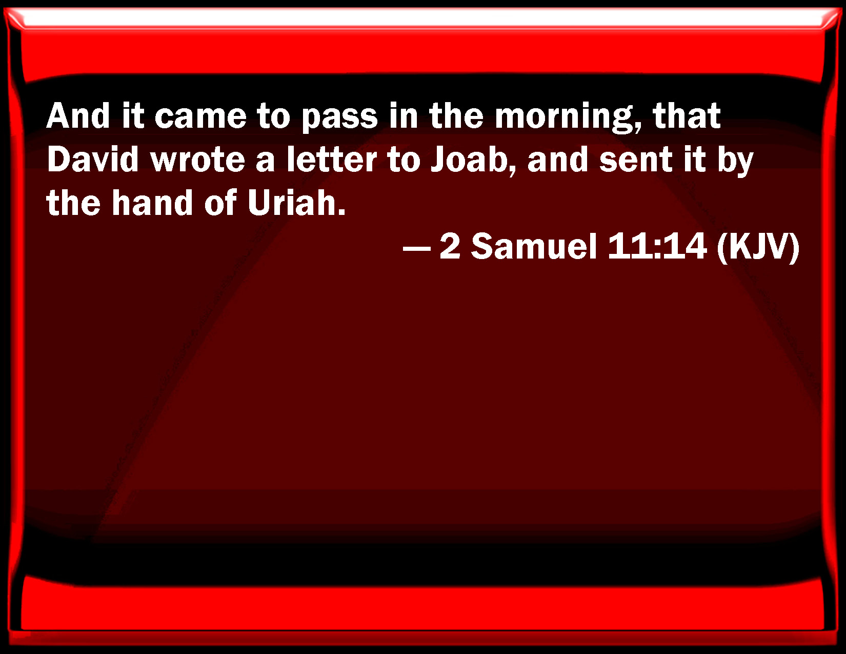 Bible Verse Slide 2 Samuel 11:14 And it came to pass in the morning, that David wrote a letter to Joab, and sent it by the hand of Uriah. KJV: And it came to pass in the morning, that David wrote a letter to Joab, and sent it by the hand of Uriah. DRB: And when the morning was come, David wrote a letter to Joab: and sent it by the hand of Urias, DBT: And it came to pass in the morning, that David wrote a letter to Joab, and sent it by Urijah. ERV: And it came to pass in the morning, that David wrote a letter to Joab, and sent it by the hand of Uriah. WBT: And it came to pass in the morning, that David wrote a letter to Joab, and sent it by the hand of Uriah. WEB: It happened in the morning, that David wrote a letter to Joab, and sent it by the hand of Uriah. YLT: And it cometh to pass in the morning, that David writeth a letter unto Joab, and sendeth by the hand of Uriah;Links 2 Samuel 11:14 NIV • 2 Samuel 11:14 NLT • 2 Samuel 11:14 ESV • 2 Samuel 11:14 NASB • 2 Samuel 11:14 KJV • 2 Samuel 11:14 Interlinear • 2 Samuel 11:14 Commentaries • 2 Samuel 11:14 Parallel Texts • 2 Samuel 11:14 Bible Apps • 2 Samuel 11:14 Parallel • Bible Hub |