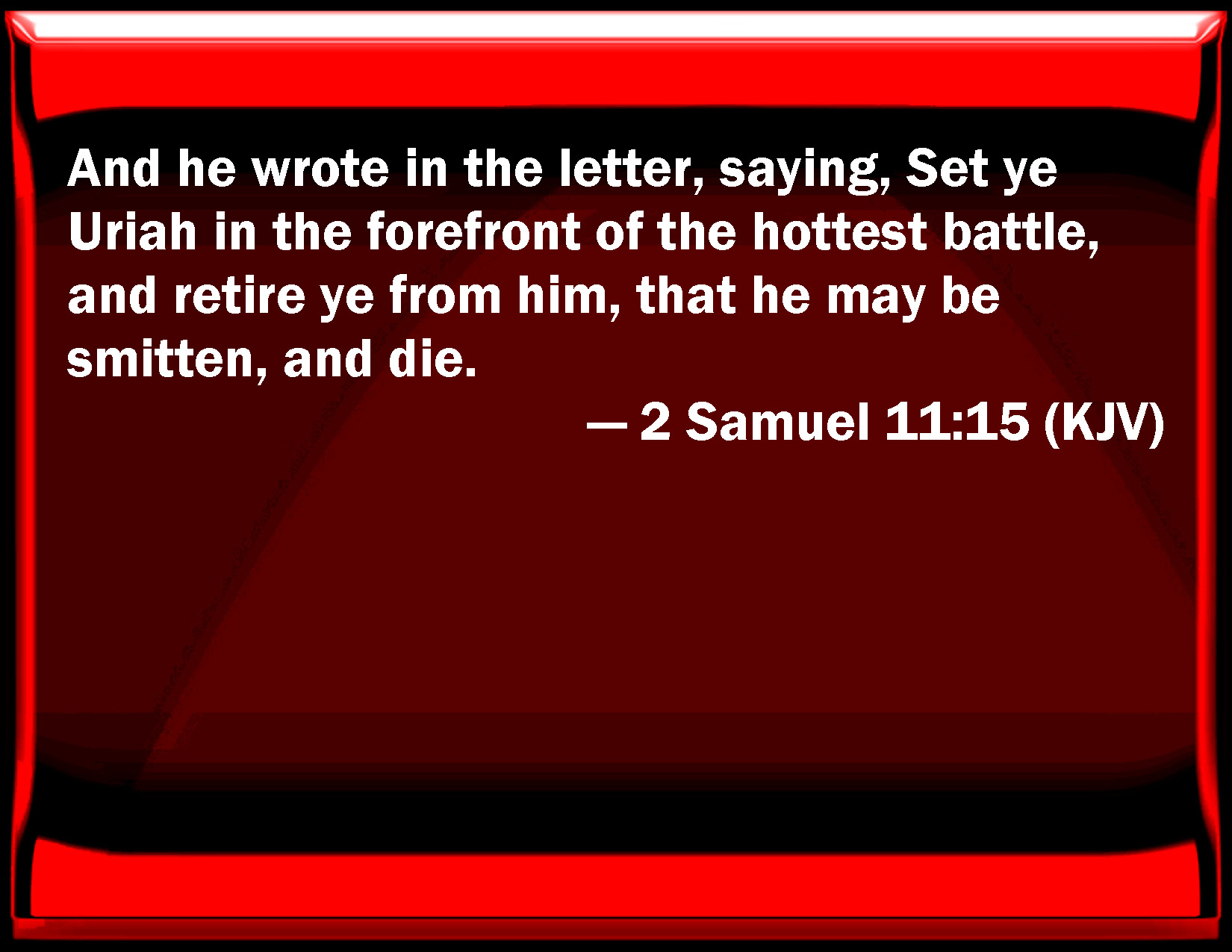 Bible Verse Slide 2 Samuel 11:15 And he wrote in the letter, saying, Set you Uriah in the forefront of the hottest battle, and retire you from him, that he may be smitten, and die. KJV: And he wrote in the letter, saying, Set ye Uriah in the forefront of the hottest battle, and retire ye from him, that he may be smitten, and die. DRB: Writing in the letter: Set ye Urias in the front of the battle, where the fight is strongest: and leave ye him, that he may be wounded and die. DBT: And he wrote in the letter saying, Set Urijah in the front of the thickest fight, and withdraw from him, that he may be smitten and die. ERV: And he wrote in the letter, saying, Set ye Uriah in the forefront of the hottest battle, and retire ye from him, that he may be smitten, and die. WBT: And he wrote in the letter, saying, Set ye Uriah in the front of the hottest battle, and retire ye from him, that he may be smitten, and die. WEB: He wrote in the letter, saying, "Send Uriah to the forefront of the hottest battle, and retreat from him, that he may be struck, and die." YLT: and he writeth in the letter, saying, 'Place ye Uriah over-against the front of the severest battle, and ye have turned back from after him, and he hath been smitten, and hath died.'Links 2 Samuel 11:15 NIV • 2 Samuel 11:15 NLT • 2 Samuel 11:15 ESV • 2 Samuel 11:15 NASB • 2 Samuel 11:15 KJV • 2 Samuel 11:15 Interlinear • 2 Samuel 11:15 Commentaries • 2 Samuel 11:15 Parallel Texts • 2 Samuel 11:15 Bible Apps • 2 Samuel 11:15 Parallel • Bible Hub |