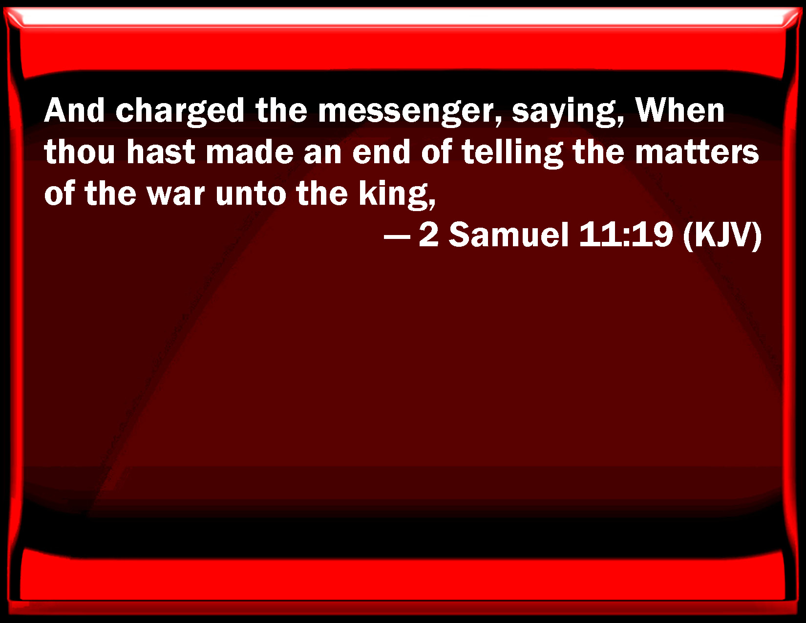 Bible Verse Slide 2 Samuel 11:19 And charged the messenger, saying, When you have made an end of telling the matters of the war to the king, KJV: And charged the messenger, saying, When thou hast made an end of telling the matters of the war unto the king, DRB: And he charged the messenger, saying: When thou hast told all the words of the battle to the king, DBT: and charged the messenger, saying, When thou hast ended telling the matters of the war to the king, ERV: and he charged the messenger, saying, When thou hast made an end of telling all the things concerning the war unto the king, WBT: And charged the messenger, saying, When thou hast made an end of telling the matters of the war to the king, WEB: and he commanded the messenger, saying, "When you have finished telling all the things concerning the war to the king, YLT: and commandeth the messenger, saying, 'At thy finishing all the matters of the war to speak unto the king,Links 2 Samuel 11:19 NIV • 2 Samuel 11:19 NLT • 2 Samuel 11:19 ESV • 2 Samuel 11:19 NASB • 2 Samuel 11:19 KJV • 2 Samuel 11:19 Interlinear • 2 Samuel 11:19 Commentaries • 2 Samuel 11:19 Parallel Texts • 2 Samuel 11:19 Bible Apps • 2 Samuel 11:19 Parallel • Bible Hub |
