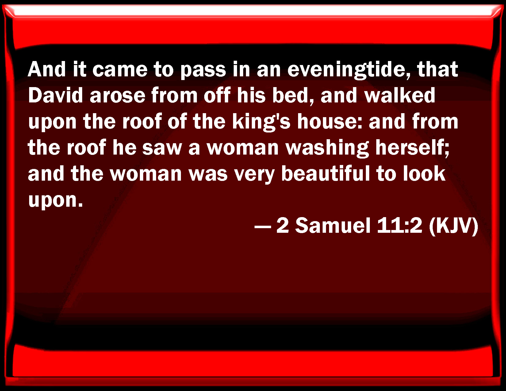 Bible Verse Slide 2 Samuel 11:2 And it came to pass in an evening, that David arose from off his bed, and walked on the roof of the king's house: and from the roof he saw a woman washing herself; and the woman was very beautiful to look on. KJV: And it came to pass in an eveningtide, that David arose from off his bed, and walked upon the roof of the king's house: and from the roof he saw a woman washing herself; and the woman was very beautiful to look upon. DRB: In the mean time it happened that David arose from his bed after noon, and walked upon the roof of the king's house: and he saw from the roof of his house a woman washing herself, over against him: and the woman was very beautiful. DBT: And it came to pass at evening time that David arose from off his couch, and walked upon the roof of the king's house; and from the roof he saw a woman bathing, and the woman was very beautiful; ERV: And it came to pass at eventide, that David arose from off his bed, and walked upon the roof of the king's house: and from the roof he saw a woman bathing; and the woman was very beautiful to look upon. WBT: And it came to pass in an evening, that David arose from off his bed, and walked upon the roof of the king's house: and from the roof he saw a woman washing herself; and the woman was very beautiful to look upon. WEB: It happened at evening, that David arose from off his bed, and walked on the roof of the king's house: and from the roof he saw a woman bathing; and the woman was very beautiful to look on. YLT: and it cometh to pass, at evening-time, that David riseth from off his couch, and walketh up and down on the roof of the king's house, and seeth from the roof a woman bathing, and the woman is of very good appearance,Links 2 Samuel 11:2 NIV • 2 Samuel 11:2 NLT • 2 Samuel 11:2 ESV • 2 Samuel 11:2 NASB • 2 Samuel 11:2 KJV • 2 Samuel 11:2 Interlinear • 2 Samuel 11:2 Commentaries • 2 Samuel 11:2 Parallel Texts • 2 Samuel 11:2 Bible Apps • 2 Samuel 11:2 Parallel • Bible Hub |