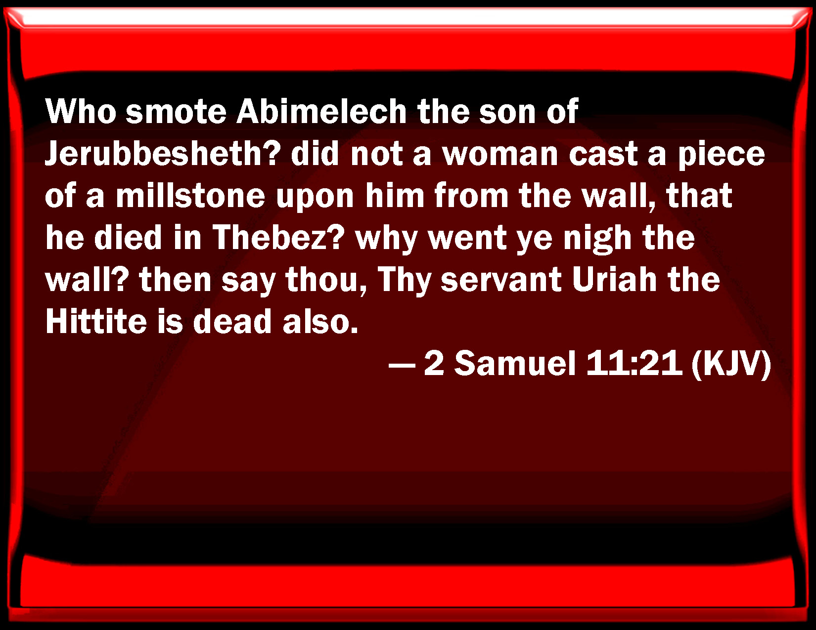 Bible Verse Slide 2 Samuel 11:21 Who smote Abimelech the son of Jerubbesheth? did not a woman cast a piece of a millstone on him from the wall, that he died in Thebez? why went you near the wall? then say you, Your servant Uriah the Hittite is dead also. KJV: Who smote Abimelech the son of Jerubbesheth? did not a woman cast a piece of a millstone upon him from the wall, that he died in Thebez? why went ye nigh the wall? then say thou, Thy servant Uriah the Hittite is dead also. DRB: Who killed Abimelech the son of Jerobaal? did not a woman cast a piece of a millstone upon him from the wall, and slew him in Thebes? Why did you go near the wall? Thou shalt say: Thy servant Urias the Hethite is also slain. DBT: Who smote Abimelech the son of Jerubbesheth? did not a woman cast the upper stone of a handmill from the wall, that he died in Thebez? why did ye go near the wall? then say thou, Thy servant Urijah the Hittite is dead also. ERV: who smote Abimelech the son of Jerubbesheth? did not a woman cast an upper millstone upon him from the wall, that he died at Thebez? why went ye so nigh the wall? then shalt thou say, Thy servant Uriah the Hittite is dead also. WBT: Who smote Abimelech the son of Jerubbesheth? did not a woman cast a piece of a millstone upon him from the wall, that he died in Thebez? why went ye nigh the wall? then say thou, Thy servant Uriah the Hittite is dead also. WEB: who struck Abimelech the son of Jerubbesheth? Didn't a woman cast an upper millstone on him from the wall, so that he died at Thebez? Why did you go so near the wall?' then you shall say, 'Your servant Uriah the Hittite is dead also.'" YLT: Who smote Abimelech son of Jerubbesheth? did not a woman cast on him a piece of a rider from the wall, and he dieth in Thebez? why drew ye nigh unto the wall? that thou hast said, Also thy servant Uriah the Hittite is dead.'Links 2 Samuel 11:21 NIV • 2 Samuel 11:21 NLT • 2 Samuel 11:21 ESV • 2 Samuel 11:21 NASB • 2 Samuel 11:21 KJV • 2 Samuel 11:21 Interlinear • 2 Samuel 11:21 Commentaries • 2 Samuel 11:21 Parallel Texts • 2 Samuel 11:21 Bible Apps • 2 Samuel 11:21 Parallel • Bible Hub |