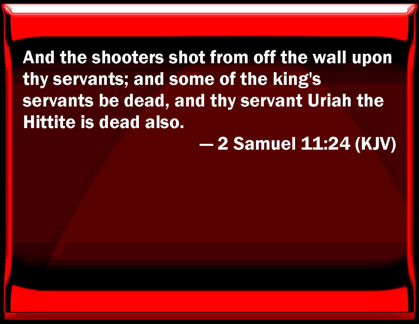 Bible Verse Slide 2 Samuel 11:24 And the shooters shot from off the wall on your servants; and some of the king's servants be dead, and your servant Uriah the Hittite is dead also. KJV: And the shooters shot from off the wall upon thy servants; and some of the king's servants be dead, and thy servant Uriah the Hittite is dead also. DRB: And the archers shot their arrows at thy servants from off the wall above: and some of the king's servants are slain, and thy servant Urias the Hethite is also dead. DBT: And the shooters shot from upon the wall against thy servants; and some of the king's servants are dead, and thy servant Urijah the Hittite is dead also. ERV: And the shooters shot at thy servants from off the wall; and some of the king's servants be dead, and thy servant Uriah the Hittite is dead also. WBT: And the shooters shot from off the wall upon thy servants: and some of the king's servants are dead, and thy servant Uriah the Hittite is dead also. WEB: The shooters shot at your servants from off the wall; and some of the king's servants are dead, and your servant Uriah the Hittite is dead also." YLT: and those shooting shoot at thy servants from off the wall, and some of the servants of the king are dead, and also, thy servant Uriah the Hittite is dead.Links 2 Samuel 11:24 NIV • 2 Samuel 11:24 NLT • 2 Samuel 11:24 ESV • 2 Samuel 11:24 NASB • 2 Samuel 11:24 KJV • 2 Samuel 11:24 Interlinear • 2 Samuel 11:24 Commentaries • 2 Samuel 11:24 Parallel Texts • 2 Samuel 11:24 Bible Apps • 2 Samuel 11:24 Parallel • Bible Hub |
