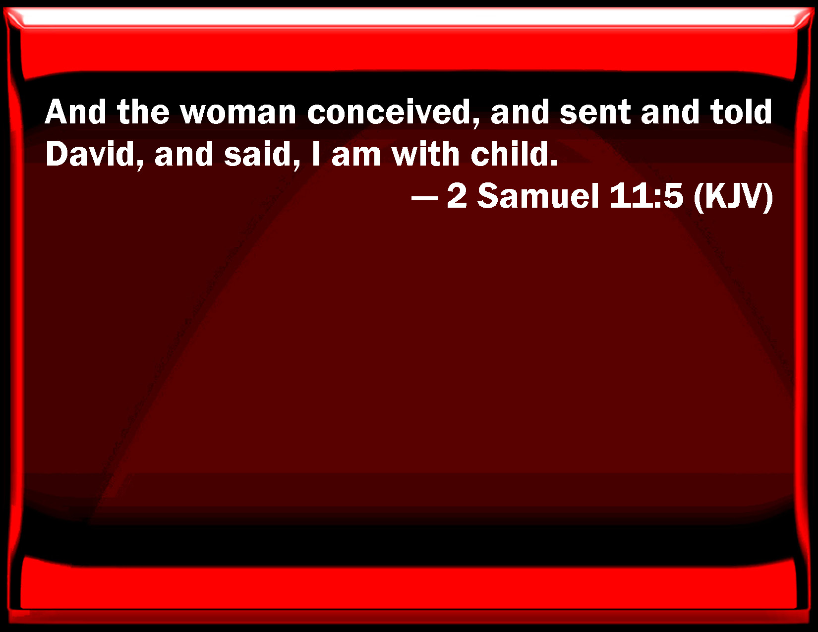 Bible Verse Slide 2 Samuel 11:5 And the woman conceived, and sent and told David, and said, I am with child. KJV: And the woman conceived, and sent and told David, and said, I am with child. DRB: And she returned to her house having conceived. And she sent and told David, and said: I have conceived. DBT: And the woman conceived, and sent and told David, and said, I am with child. ERV: And the woman conceived; and she sent and told David, and said, I am with child. WBT: And the woman conceived, and sent and told David, and said, I am with child. WEB: The woman conceived; and she sent and told David, and said, "I am with child." YLT: and the woman conceiveth, and sendeth, and declareth to David, and saith, 'I am conceiving.'Links 2 Samuel 11:5 NIV • 2 Samuel 11:5 NLT • 2 Samuel 11:5 ESV • 2 Samuel 11:5 NASB • 2 Samuel 11:5 KJV • 2 Samuel 11:5 Interlinear • 2 Samuel 11:5 Commentaries • 2 Samuel 11:5 Parallel Texts • 2 Samuel 11:5 Bible Apps • 2 Samuel 11:5 Parallel • Bible Hub |