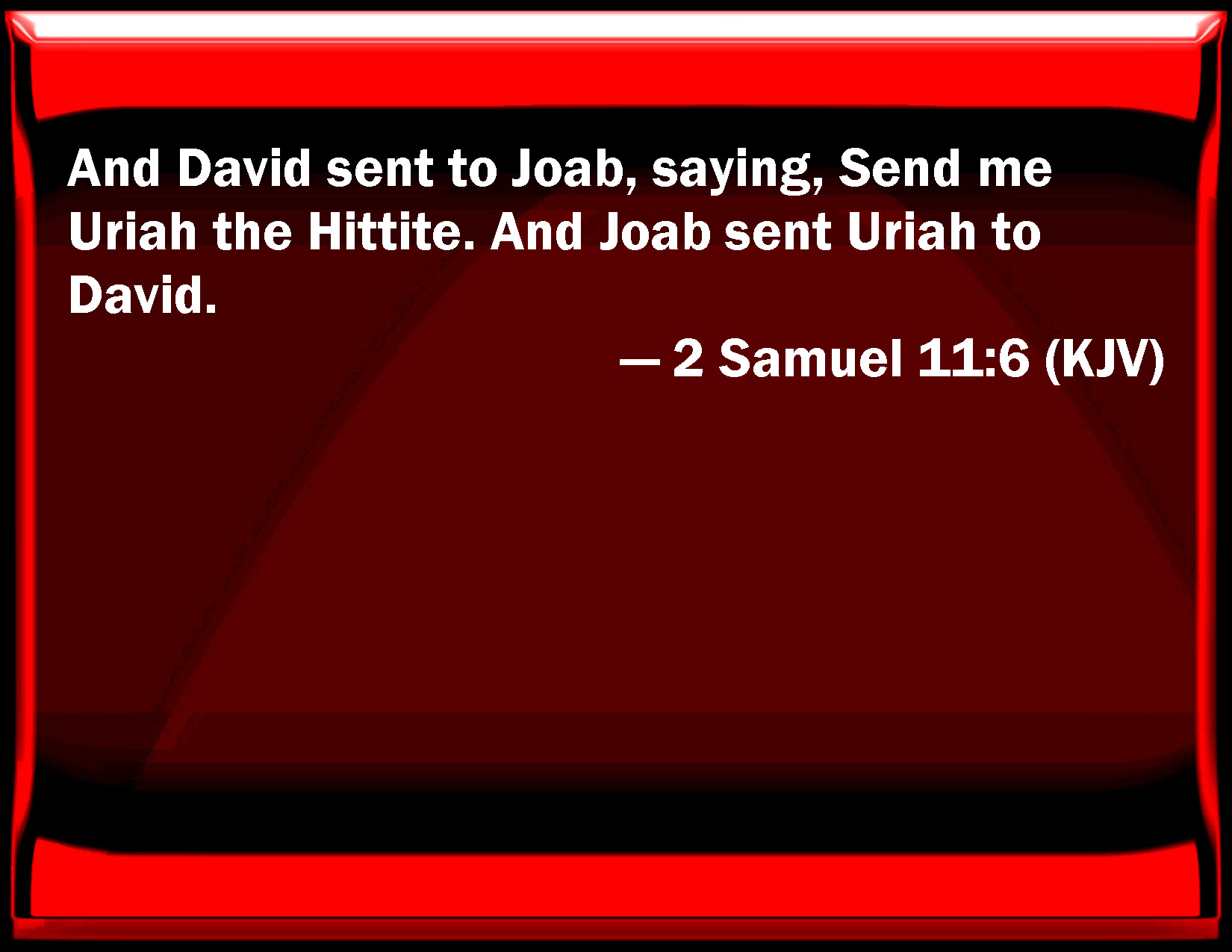Bible Verse Slide 2 Samuel 11:6 And David sent to Joab, saying, Send me Uriah the Hittite. And Joab sent Uriah to David. KJV: And David sent to Joab, saying, Send me Uriah the Hittite. And Joab sent Uriah to David. DRB: And David sent to Joab, saying: Send me Urias the Hethite. And Joab sent Urias to David. DBT: And David sent to Joab saying, Send me Urijah the Hittite. And Joab sent Urijah to David. ERV: And David sent to Joab, saying, Send me Uriah the Hittite. And Joab sent Uriah to David. WBT: And David sent to Joab, saying, Send me Uriah the Hittite. And Joab sent Uriah to David. WEB: David sent to Joab, [saying], "Send me Uriah the Hittite." Joab sent Uriah to David. YLT: And David sendeth unto Joab, 'Send unto me Uriah the Hittite,' and Joab sendeth Uriah unto David;Links 2 Samuel 11:6 NIV • 2 Samuel 11:6 NLT • 2 Samuel 11:6 ESV • 2 Samuel 11:6 NASB • 2 Samuel 11:6 KJV • 2 Samuel 11:6 Interlinear • 2 Samuel 11:6 Commentaries • 2 Samuel 11:6 Parallel Texts • 2 Samuel 11:6 Bible Apps • 2 Samuel 11:6 Parallel • Bible Hub |