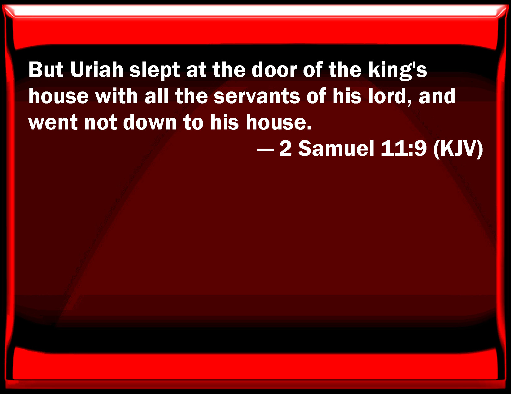 Bible Verse Slide 2 Samuel 11:9 But Uriah slept at the door of the king's house with all the servants of his lord, and went not down to his house. KJV: But Uriah slept at the door of the king's house with all the servants of his lord, and went not down to his house. DRB: But Urias slept before the gate of the king's house, with the other servants of his lord, and went not down to his own house. DBT: And Urijah slept at the entrance of the king's house with all the servants of his lord, and went not down to his house. ERV: But Uriah slept at the door of the king's house with all the servants of his lord, and went not down to his house. WBT: But Uriah slept at the door of the king's house with all the servants of his lord, and went not down to his house. WEB: But Uriah slept at the door of the king's house with all the servants of his lord, and didn't go down to his house. YLT: and Uriah lieth down at the opening of the king's house, with all the servants of his lord, and hath not gone down unto his house.Links 2 Samuel 11:9 NIV • 2 Samuel 11:9 NLT • 2 Samuel 11:9 ESV • 2 Samuel 11:9 NASB • 2 Samuel 11:9 KJV • 2 Samuel 11:9 Interlinear • 2 Samuel 11:9 Commentaries • 2 Samuel 11:9 Parallel Texts • 2 Samuel 11:9 Bible Apps • 2 Samuel 11:9 Parallel • Bible Hub |