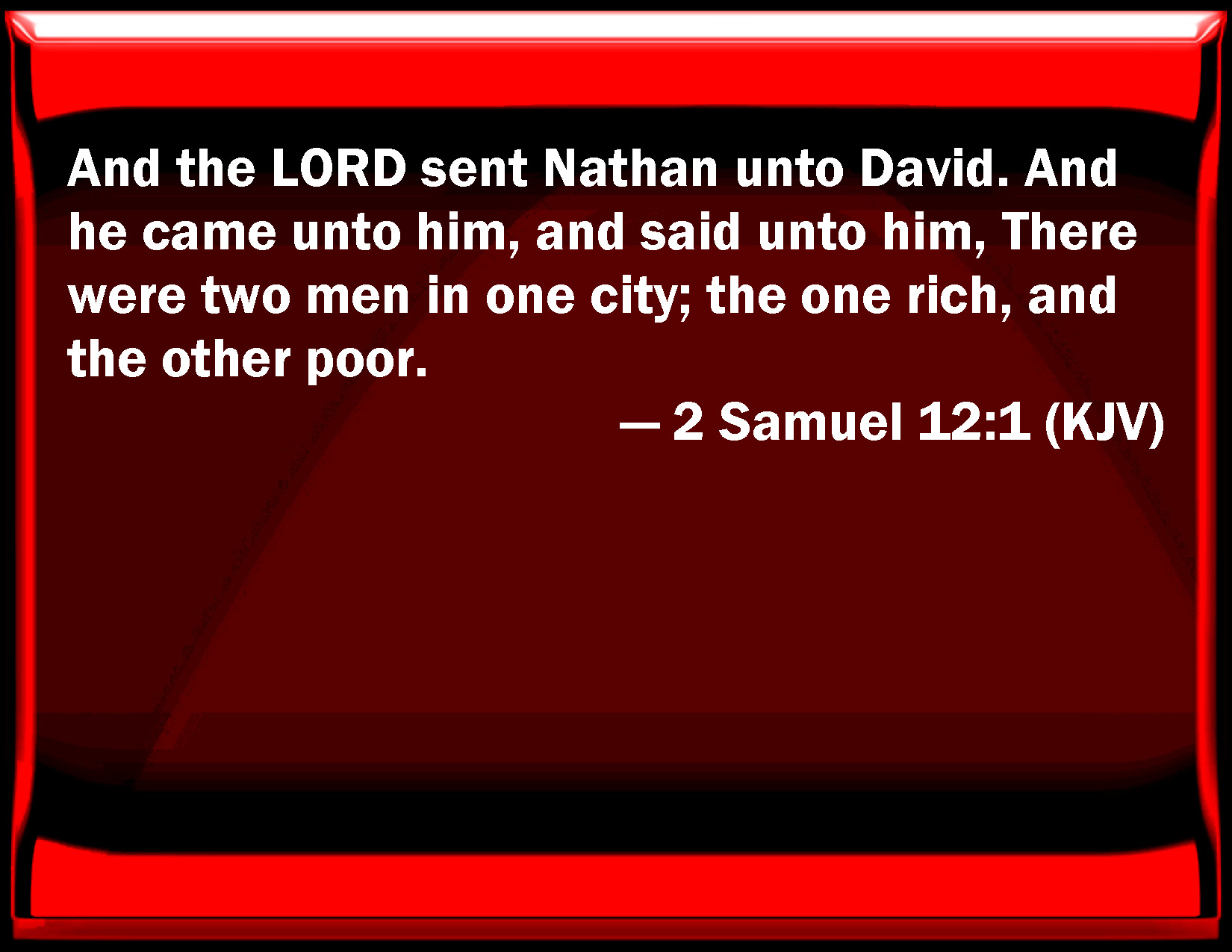 Bible Verse Slide 2 Samuel 12:1 And the LORD sent Nathan to David. And he came to him, and said to him, There were two men in one city; the one rich, and the other poor. KJV: And the LORD sent Nathan unto David. And he came unto him, and said unto him, There were two men in one city; the one rich, and the other poor. DRB: And the Lord sent Nathan to David: and when he was come to him, he said to him: There were two men in one city, the one rich, and the other poor. DBT: And Jehovah sent Nathan to David. And he came to him, and said to him, There were two men in one city; the one rich, and the other poor. ERV: And the LORD sent Nathan unto David. And he came unto him, and said unto him, There were two men in one city; the one rich, and the other poor. WBT: And the LORD sent Nathan to David. And he came to him, and said to him, There were two men in one city; the one rich, and the other poor. WEB: Yahweh sent Nathan to David. He came to him, and said to him, "There were two men in one city; the one rich, and the other poor. YLT: And Jehovah sendeth Nathan unto David, and he cometh unto him, and saith to him: 'Two men have been in one city; One rich and one poor;Links 2 Samuel 12:1 NIV • 2 Samuel 12:1 NLT • 2 Samuel 12:1 ESV • 2 Samuel 12:1 NASB • 2 Samuel 12:1 KJV • 2 Samuel 12:1 Interlinear • 2 Samuel 12:1 Commentaries • 2 Samuel 12:1 Parallel Texts • 2 Samuel 12:1 Bible Apps • 2 Samuel 12:1 Parallel • Bible Hub |