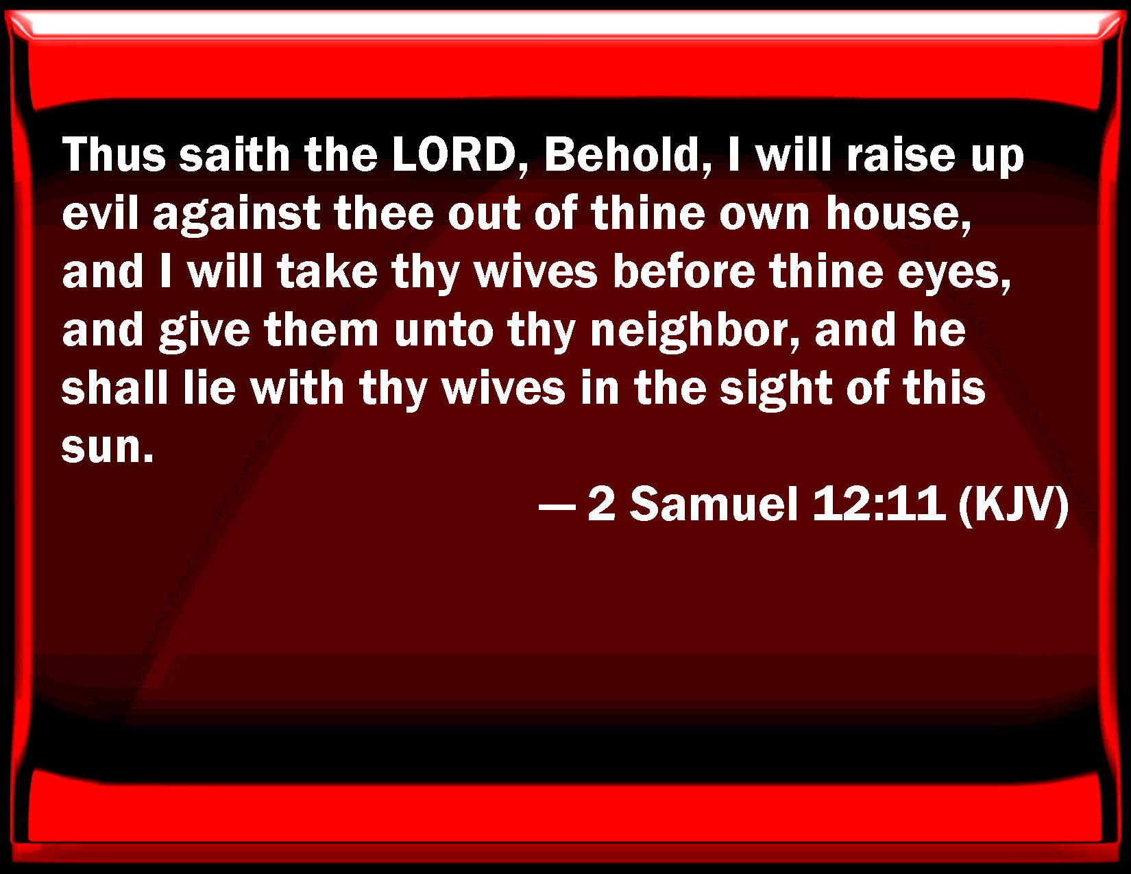 Bible Verse Slide 2 Samuel 12:11 Thus said the LORD, Behold, I will raise up evil against you out of your own house, and I will take your wives before your eyes, and give them to your neighbor, and he shall lie with your wives in the sight of this sun. KJV: Thus saith the LORD, Behold, I will raise up evil against thee out of thine own house, and I will take thy wives before thine eyes, and give them unto thy neighbour, and he shall lie with thy wives in the sight of this sun. DRB: Thus saith the Lord: Behold, I will raise up evil against thee out of thy own house, and I will take thy wives before thy eyes and give them to thy neighhour, and he shall lie with thy wives in the sight of this sun. DBT: Thus saith Jehovah: Behold, I will raise up evil against thee out of thine own house, and I will take thy wives before thine eyes, and give them unto thy neighbour, and he shall lie with thy wives in the sight of this sun. ERV: Thus saith the LORD, Behold, I will raise up evil against thee out of thine own house, and I will take thy wives before thine eyes, and give them unto thy neighbour, and he shall lie with thy wives in the sight of this sun. WBT: Thus saith the LORD, Behold, I will raise up evil against thee out of thy own house, and I will take thy wives before thy eyes, and give them to thy neighbor, and he shall lie with thy wives in the sight of this sun. WEB: "This is what Yahweh says: 'Behold, I will raise up evil against you out of your own house; and I will take your wives before your eyes, and give them to your neighbor, and he will lie with your wives in the sight of this sun. YLT: thus said Jehovah, Lo, I am raising up against thee evil, out of thy house, and have taken thy wives before thine eyes, and given to thy neighbour, and he hath lain with thy wives before the eyes of this sun;Links 2 Samuel 12:11 NIV • 2 Samuel 12:11 NLT • 2 Samuel 12:11 ESV • 2 Samuel 12:11 NASB • 2 Samuel 12:11 KJV • 2 Samuel 12:11 Interlinear • 2 Samuel 12:11 Commentaries • 2 Samuel 12:11 Parallel Texts • 2 Samuel 12:11 Bible Apps • 2 Samuel 12:11 Parallel • Bible Hub |