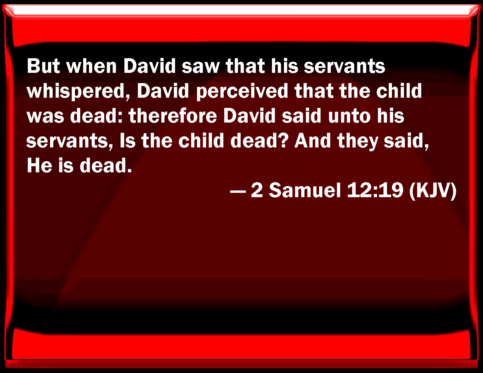 Bible Verse Slide 2 Samuel 12:19 But when David saw that his servants whispered, David perceived that the child was dead: therefore David said to his servants, Is the child dead? And they said, He is dead. KJV: But when David saw that his servants whispered, David perceived that the child was dead: therefore David said unto his servants, Is the child dead? And they said, He is dead. DRB: But when David saw his servants whispering, he understood that the child was dead: and he said to his servants: Is the child dead? They answered him: He is dead. DBT: But David saw that his servants whispered, and David perceived that the child was dead; and David said to his servants, Is the child dead? And they said, He is dead. ERV: But when David saw that his servants whispered together, David perceived that the child was dead: and David said unto his servants, Is the child dead? And they said, He is dead. WBT: But when David saw that his servants whispered, David perceived that the child was dead: therefore David said to his servants, Is the child dead? And they said, He is dead. WEB: But when David saw that his servants were whispering together, David perceived that the child was dead; and David said to his servants, "Is the child dead?" They said, "He is dead." YLT: And David seeth that his servants are whispering, and David understandeth that the lad is dead, and David saith unto his servants, 'Is the lad dead?' and they say, 'Dead.'Links 2 Samuel 12:19 NIV • 2 Samuel 12:19 NLT • 2 Samuel 12:19 ESV • 2 Samuel 12:19 NASB • 2 Samuel 12:19 KJV • 2 Samuel 12:19 Interlinear • 2 Samuel 12:19 Commentaries • 2 Samuel 12:19 Parallel Texts • 2 Samuel 12:19 Bible Apps • 2 Samuel 12:19 Parallel • Bible Hub |