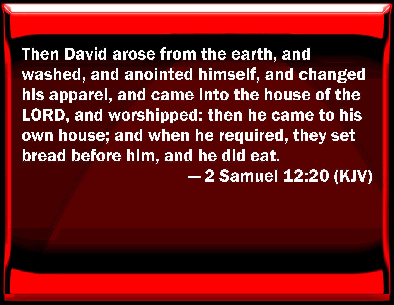 Bible Verse Slide 2 Samuel 12:20 Then David arose from the earth, and washed, and anointed himself, and changed his apparel, and came into the house of the LORD, and worshipped: then he came to his own house; and when he required, they set bread before him, and he did eat. KJV: Then David arose from the earth, and washed, and anointed himself, and changed his apparel, and came into the house of the LORD, and worshipped: then he came to his own house; and when he required, they set bread before him, and he did eat. DRB: Then David arose from the ground, and washed and anointed himself: and when he had changed his apparel, he went into the house of the Lord: and worshipped, and then he came into his own house, and he called for bread, and ate. DBT: Then David arose from the earth, and washed, and anointed himself, and changed his clothing, and entered into the house of Jehovah and worshipped; then he came to his own house and required them to set bread before him, and he ate. ERV: Then David arose from the earth, and washed, and anointed himself, and changed his apparel; and he came into the house of the LORD, and worshipped: then he came to his own house; and when he required they set bread before him, and he did eat. WBT: Then David arose from the earth, and washed, and anointed himself, and changed his apparel, and came into the house of the LORD, and worshiped: then he came to his own house; and when he required, they set bread before him, and he ate. WEB: Then David arose from the earth, and washed, and anointed himself, and changed his clothing; and he came into the house of Yahweh, and worshiped: then he came to his own house; and when he required, they set bread before him, and he ate. YLT: And David riseth from the earth, and doth bathe and anoint himself, and changeth his raiment, and cometh in to the house of Jehovah, and boweth himself, and cometh unto his house, and asketh and they place for him bread, and he eateth.Links 2 Samuel 12:20 NIV • 2 Samuel 12:20 NLT • 2 Samuel 12:20 ESV • 2 Samuel 12:20 NASB • 2 Samuel 12:20 KJV • 2 Samuel 12:20 Interlinear • 2 Samuel 12:20 Commentaries • 2 Samuel 12:20 Parallel Texts • 2 Samuel 12:20 Bible Apps • 2 Samuel 12:20 Parallel • Bible Hub |