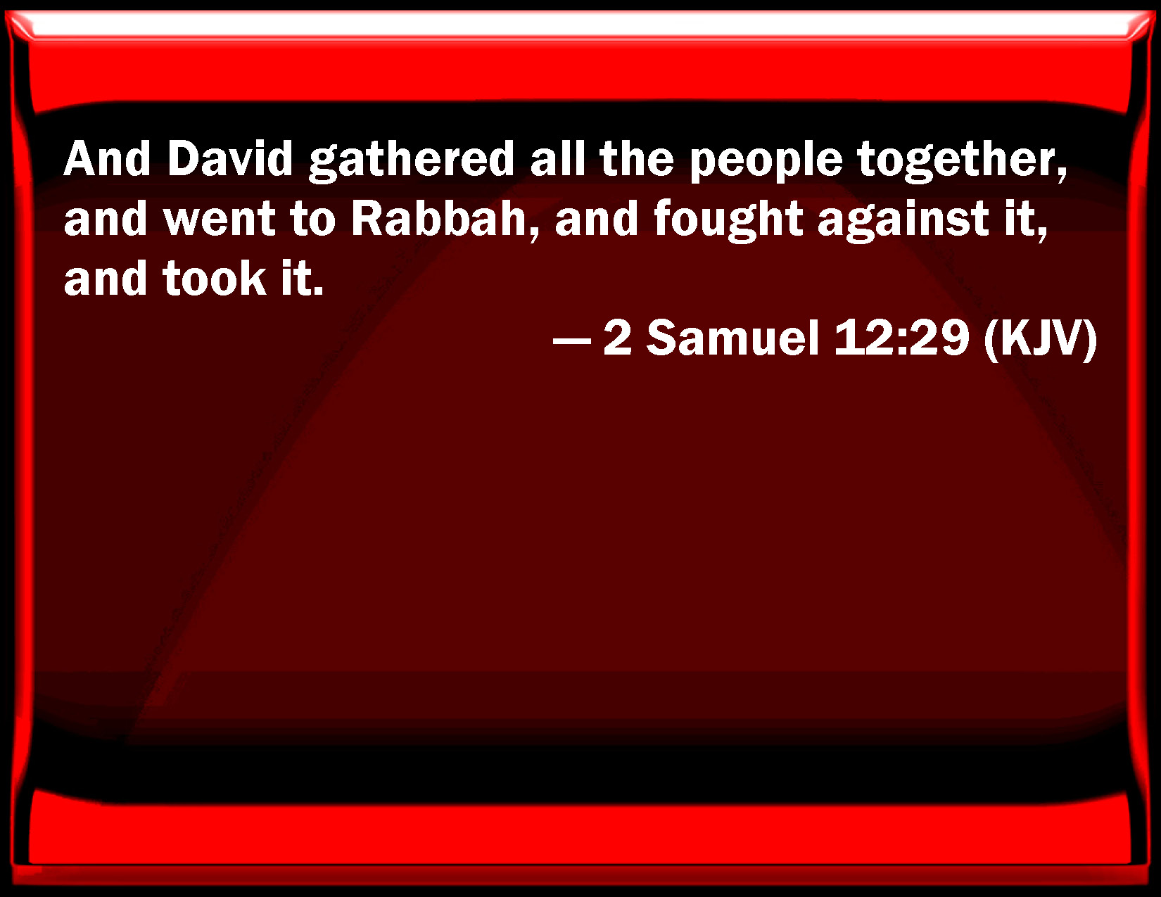 Bible Verse Slide 2 Samuel 12:29 And David gathered all the people together, and went to Rabbah, and fought against it, and took it. KJV: And David gathered all the people together, and went to Rabbah, and fought against it, and took it. DRB: Then David gathered all the people together, and went out against Rabbath: and after fighting, he took it. DBT: And David gathered all the people, and went to Rabbah, and fought against it and took it. ERV: And David gathered all the people together, and went to Rabbah, and fought against it, and took it. WBT: And David collected all the people, and went to Rabbah, and fought against it, and took it. WEB: David gathered all the people together, and went to Rabbah, and fought against it, and took it. YLT: And David gathereth all the people, and goeth to Rabbah, and fighteth against it, and captureth it;Links 2 Samuel 12:29 NIV • 2 Samuel 12:29 NLT • 2 Samuel 12:29 ESV • 2 Samuel 12:29 NASB • 2 Samuel 12:29 KJV • 2 Samuel 12:29 Interlinear • 2 Samuel 12:29 Commentaries • 2 Samuel 12:29 Parallel Texts • 2 Samuel 12:29 Bible Apps • 2 Samuel 12:29 Parallel • Bible Hub |