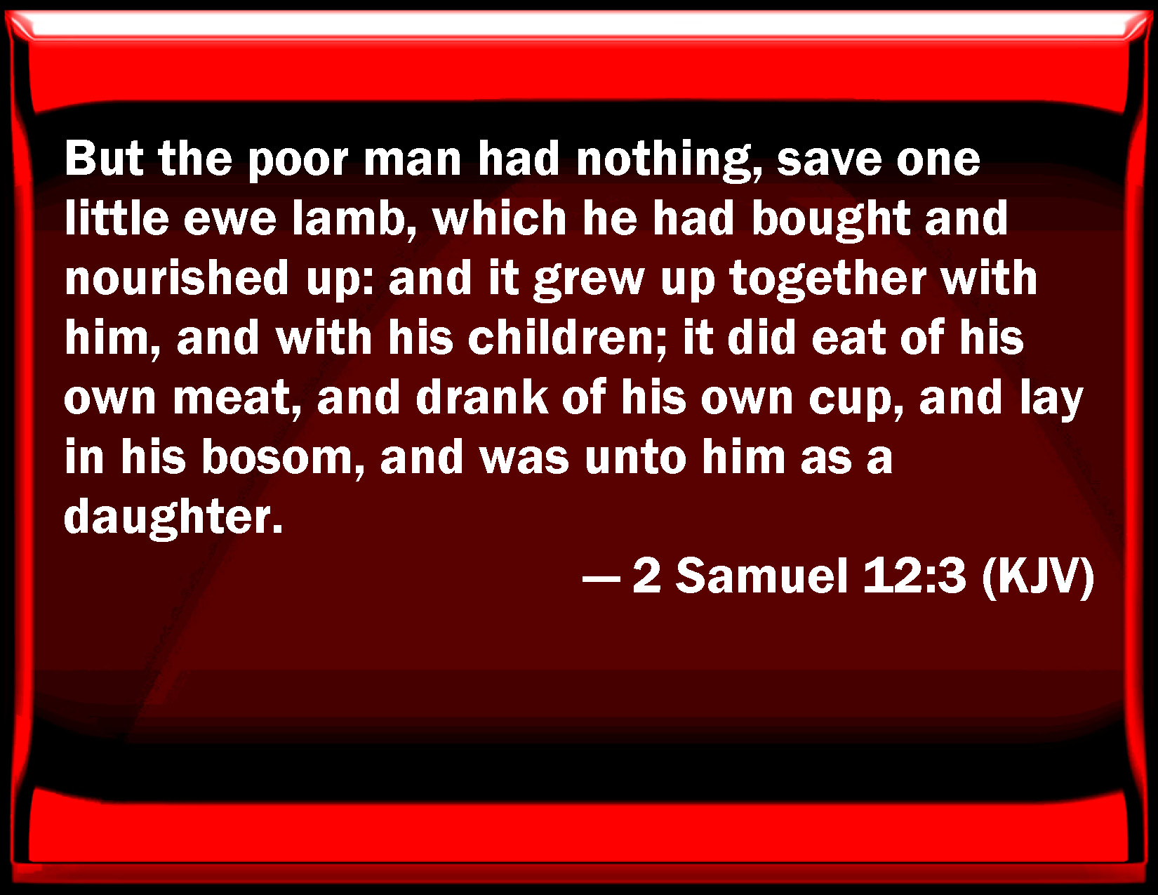 Bible Verse Slide 2 Samuel 12:3 But the poor man had nothing, save one little ewe lamb, which he had bought and nourished up: and it grew up together with him, and with his children; it did eat of his own meat, and drank of his own cup, and lay in his bosom, and was to him as a daughter. KJV: But the poor man had nothing, save one little ewe lamb, which he had bought and nourished up: and it grew up together with him, and with his children; it did eat of his own meat, and drank of his own cup, and lay in his bosom, and was unto him as a daughter. DRB: But the poor man had nothing at all but one little ewe lamb, which he had bought and nourished up, and which had grown up in his house together with his children, eating of his bread, and drinking of his cup, and sleeping in his bosom: and it was unto him as a daughter. DBT: but the poor man had nothing at all, but one little ewe lamb which he had bought, and was nourishing; and it grew up with him, and together with his children: it ate of his morsel, and drank of his own cup, and slept in his bosom, and was to him as a daughter. ERV: but the poor man had nothing, save one little ewe lamb, which he had bought and nourished up: and it grew up together with him, and with his children; it did eat of his own morsel, and drank of his own cup, and lay in his bosom, and was unto him as a daughter. WBT: But the poor man had nothing save one little ewe-lamb, which he had bought and nourished: and it grew up together with him, and with his children: it fed of his own meat, and drank of his own cup, and lay in his bosom, and was to him as a daughter. WEB: but the poor man had nothing, except one little ewe lamb, which he had bought and raised. It grew up together with him, and with his children. It ate of his own food, drank of his own cup, and lay in his bosom, and was to him like a daughter. YLT: And the poor one hath nothing, Except one little ewe-lamb, Which he hath bought, and keepeth alive, And it groweth up with him, And with his sons together; Of his morsel it eateth, And from his cup it drinketh, And in his bosom it lieth, And it is to him as a daughter;Links 2 Samuel 12:3 NIV • 2 Samuel 12:3 NLT • 2 Samuel 12:3 ESV • 2 Samuel 12:3 NASB • 2 Samuel 12:3 KJV • 2 Samuel 12:3 Interlinear • 2 Samuel 12:3 Commentaries • 2 Samuel 12:3 Parallel Texts • 2 Samuel 12:3 Bible Apps • 2 Samuel 12:3 Parallel • Bible Hub |