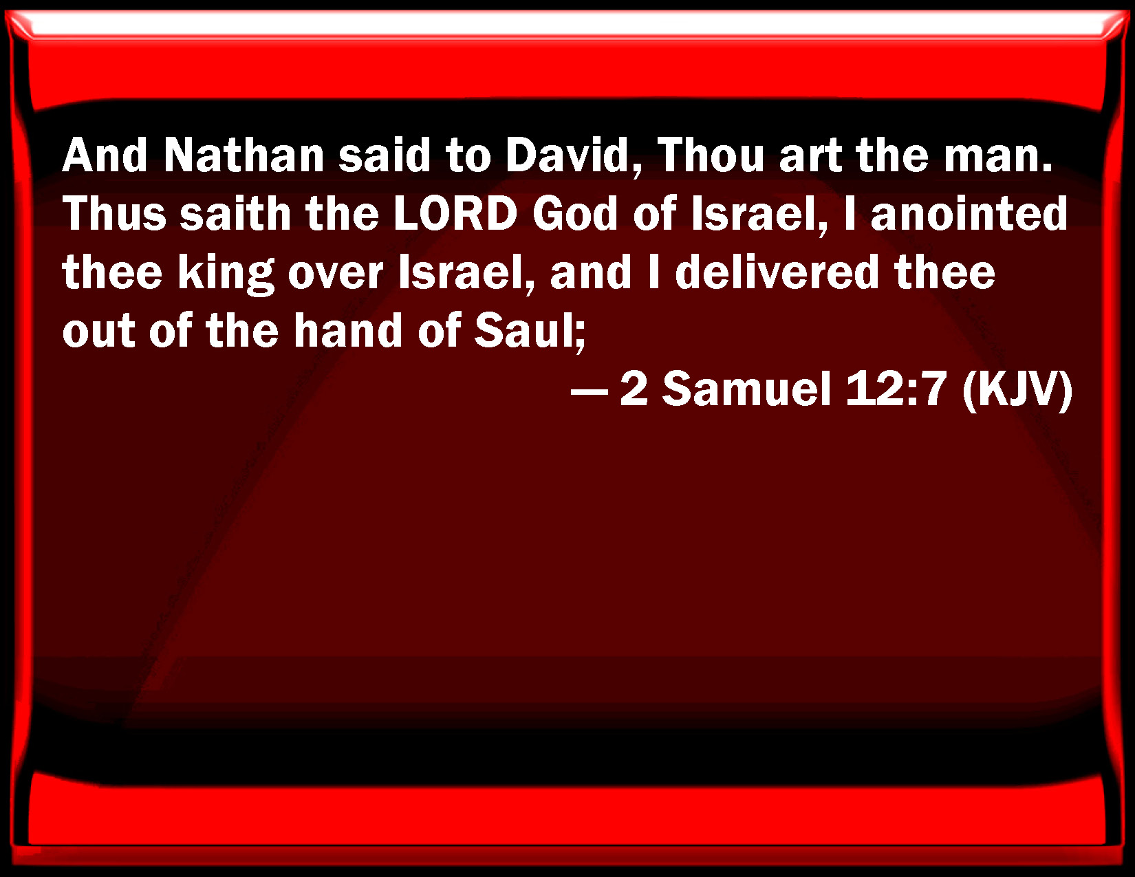 Bible Verse Slide 2 Samuel 12:7 And Nathan said to David, You are the man. Thus said the LORD God of Israel, I anointed you king over Israel, and I delivered you out of the hand of Saul; KJV: And Nathan said to David, Thou art the man. Thus saith the LORD God of Israel, I anointed thee king over Israel, and I delivered thee out of the hand of Saul; DRB: And Nathan said to David: Thou art the man. Thus saith the Lord the God of Israel: I anointed thee king over Israel, and I delivered thee from the hand of Saul, DBT: And Nathan said to David, Thou art the man! Thus saith Jehovah the God of Israel: I anointed thee king over Israel, and I delivered thee out of the hand of Saul; ERV: And Nathan said to David, Thou art the man. Thus saith the LORD, the God of Israel, I anointed thee king over Israel, and I delivered thee out of the hand of Saul; WBT: And Nathan said to David, Thou art the man. Thus saith the LORD God of Israel, I anointed thee king over Israel, and I delivered thee from the hand of Saul; WEB: Nathan said to David, "You are the man. This is what Yahweh, the God of Israel, says: 'I anointed you king over Israel, and I delivered you out of the hand of Saul. YLT: And Nathan saith unto David, 'Thou art the man! Thus said Jehovah, God of Israel, I anointed thee for king over Israel, and I delivered thee out of the hand of Saul;Links 2 Samuel 12:7 NIV • 2 Samuel 12:7 NLT • 2 Samuel 12:7 ESV • 2 Samuel 12:7 NASB • 2 Samuel 12:7 KJV • 2 Samuel 12:7 Interlinear • 2 Samuel 12:7 Commentaries • 2 Samuel 12:7 Parallel Texts • 2 Samuel 12:7 Bible Apps • 2 Samuel 12:7 Parallel • Bible Hub |