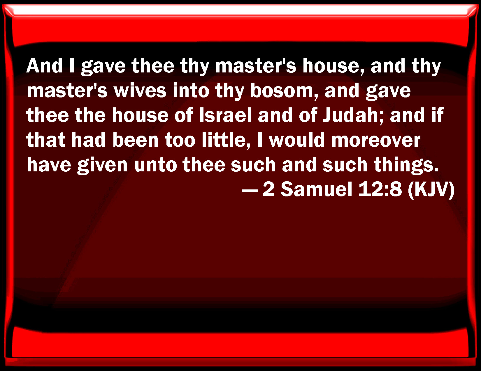 Bible Verse Slide 2 Samuel 12:8 And I gave you your master's house, and your master's wives into your bosom, and gave you the house of Israel and of Judah; and if that had been too little, I would moreover have given to you such and such things. KJV: And I gave thee thy master's house, and thy master's wives into thy bosom, and gave thee the house of Israel and of Judah; and if that had been too little, I would moreover have given unto thee such and such things. DRB: And gave thee thy master's house and thy master's wives into thy bosom, and gave thee the house of Israel and Juda: and if these things be little, I shall add far greater things unto thee. DBT: and I gave thee thy master's house, and thy master's wives into thy bosom, and gave thee the house of Israel and of Judah; and if that had been too little, I would moreover have given unto thee such and such things. ERV: and I gave thee thy master's house, and thy master's wives into thy bosom, and gave thee the house of Israel and of Judah; and if that had been too little, I would have added unto thee such and such things. WBT: And I gave thee thy master's house, and thy master's wives into thy bosom, and gave thee the house of Israel and of Judah; and if that had been too little, I would moreover have given to thee such and such things. WEB: I gave you your master's house, and your master's wives into your bosom, and gave you the house of Israel and of Judah; and if that would have been too little, I would have added to you many more such things. YLT: and I give to thee the house of thy lord, and the wives of thy lord, into thy bosom, and I give to thee the house of Israel and of Judah; and if little, then I add to thee such and such things.Links 2 Samuel 12:8 NIV • 2 Samuel 12:8 NLT • 2 Samuel 12:8 ESV • 2 Samuel 12:8 NASB • 2 Samuel 12:8 KJV • 2 Samuel 12:8 Interlinear • 2 Samuel 12:8 Commentaries • 2 Samuel 12:8 Parallel Texts • 2 Samuel 12:8 Bible Apps • 2 Samuel 12:8 Parallel • Bible Hub |