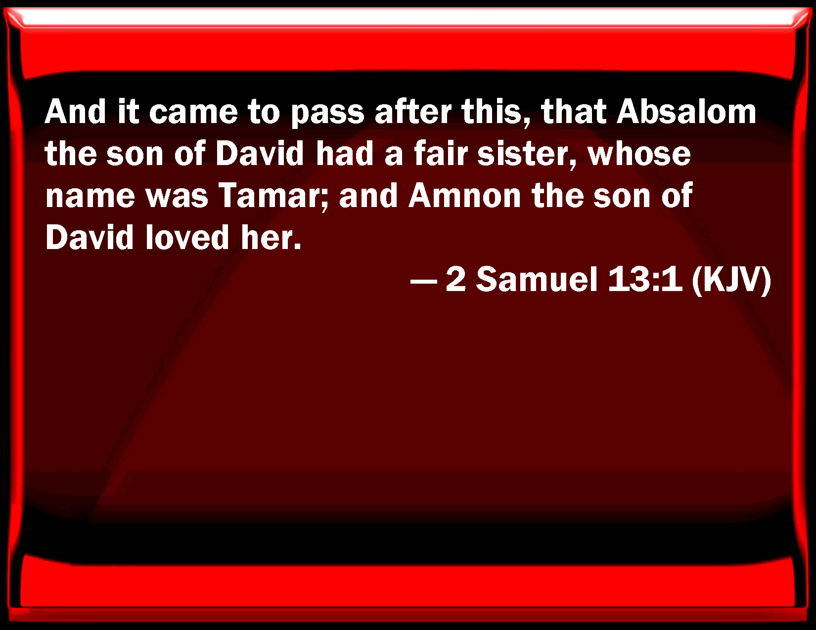 Bible Verse Slide 2 Samuel 13:1 And it came to pass after this, that Absalom the son of David had a fair sister, whose name was Tamar; and Amnon the son of David loved her. KJV: And it came to pass after this, that Absalom the son of David had a fair sister, whose name was Tamar; and Amnon the son of David loved her. DRB: And it came to pass after this, that Amnon the son of David loved the sister of Absalom the son of David, who was very beautiful, and her name was Thamar. DBT: And it came to pass after this, that Absalom the son of David having a beautiful sister, whose name was Tamar, Amnon the son of David loved her. ERV: And it came to pass after this, that Absalom the son of David had a fair sister, whose name was Tamar; and Amnon the son of David loved her. WBT: And it came to pass after this, that Absalom the son of David had a fair sister, whose name was Tamar; and Amnon the son of David loved her. WEB: It happened after this, that Absalom the son of David had a beautiful sister, whose name was Tamar; and Amnon the son of David loved her. YLT: And it cometh to pass afterwards that Absalom son of David hath a fair sister, and her name is Tamar, and Amnon son of David loveth her.Links 2 Samuel 13:1 NIV • 2 Samuel 13:1 NLT • 2 Samuel 13:1 ESV • 2 Samuel 13:1 NASB • 2 Samuel 13:1 KJV • 2 Samuel 13:1 Interlinear • 2 Samuel 13:1 Commentaries • 2 Samuel 13:1 Parallel Texts • 2 Samuel 13:1 Bible Apps • 2 Samuel 13:1 Parallel • Bible Hub |
