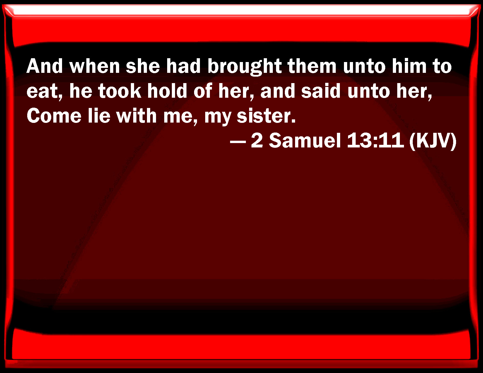 Bible Verse Slide 2 Samuel 13:11 And when she had brought them to him to eat, he took hold of her, and said to her, Come lie with me, my sister. KJV: And when she had brought them unto him to eat, he took hold of her, and said unto her, Come lie with me, my sister. DRB: And when she had presented him the meat, he took hold of her, and said: Come lie with me, my sister. DBT: And she presented them to him to eat; and he took hold of her, and said to her, Come, lie with me, my sister. ERV: And when she had brought them near unto him to eat, he took hold of her, and said unto her, Come lie with me, my sister. WBT: And when she had brought them to him to eat, he took hold of her, and said to her, Come, lie with me, my sister. WEB: When she had brought them near to him to eat, he took hold of her, and said to her, "Come, lie with me, my sister!" YLT: and she bringeth nigh unto him to eat, and he layeth hold on her, and saith to her, 'Come, lie with me, my sister.'Links 2 Samuel 13:11 NIV • 2 Samuel 13:11 NLT • 2 Samuel 13:11 ESV • 2 Samuel 13:11 NASB • 2 Samuel 13:11 KJV • 2 Samuel 13:11 Interlinear • 2 Samuel 13:11 Commentaries • 2 Samuel 13:11 Parallel Texts • 2 Samuel 13:11 Bible Apps • 2 Samuel 13:11 Parallel • Bible Hub |