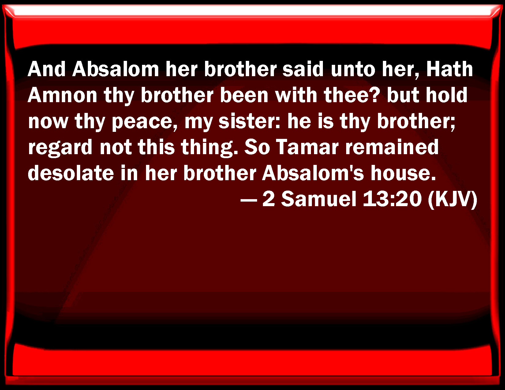 Bible Verse Slide 2 Samuel 13:20 And Absalom her brother said to her, Has Amnon your brother been with you? but hold now your peace, my sister: he is your brother; regard not this thing. So Tamar remained desolate in her brother Absalom's house. KJV: And Absalom her brother said unto her, Hath Amnon thy brother been with thee? but hold now thy peace, my sister: he is thy brother; regard not this thing. So Tamar remained desolate in her brother Absalom's house. DRB: And Absalom her brother said to her: Hath thy brother Amnon lain with thee? but now, sister, hold thy peace, he is thy brother: and afflict not thy heart for this thing. So Thamar remained pining away in the house of Absalom her brother. DBT: And Absalom her brother said to her, Has Amnon thy brother been with thee? and now, my sister, be still: he is thy brother; take not this thing to heart. And Tamar remained, and that desolate, in her brother Absalom's house. ERV: And Absalom her brother said unto her, Hath Amnon thy brother been with thee? but now hold thy peace, my sister: he is thy brother; take not this thing to heart. So Tamar remained desolate in her brother Absalom's house. WBT: And Absalom her brother said to her, Hath Amnon thy brother been with thee? but hold now thy peace, my sister: he is thy brother; regard not this thing. So Tamar remained desolate in her brother Absalom's house. WEB: Absalom her brother said to her, "Has Amnon your brother been with you? But now hold your peace, my sister. He is your brother. Don't take this thing to heart." So Tamar remained desolate in her brother Absalom's house. YLT: and Absalom her brother saith unto her, 'Hath Amnon thy brother been with thee? and now, my sister, keep silent, he is thy brother; set not thy heart to this thing;' and Tamar dwelleth — but desolate — in the house of Absalom her brother.Links 2 Samuel 13:20 NIV • 2 Samuel 13:20 NLT • 2 Samuel 13:20 ESV • 2 Samuel 13:20 NASB • 2 Samuel 13:20 KJV • 2 Samuel 13:20 Interlinear • 2 Samuel 13:20 Commentaries • 2 Samuel 13:20 Parallel Texts • 2 Samuel 13:20 Bible Apps • 2 Samuel 13:20 Parallel • Bible Hub |
