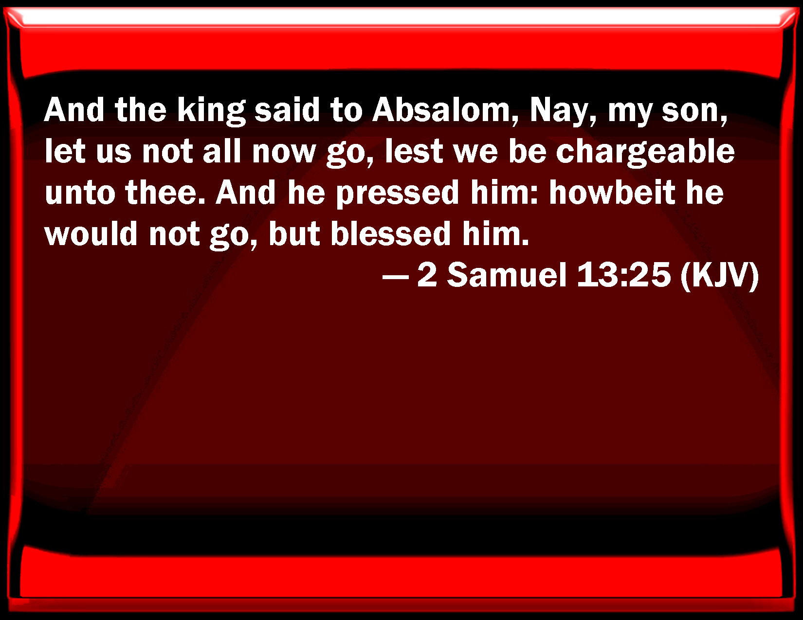 Bible Verse Slide 2 Samuel 13:25 And the king said to Absalom, No, my son, let us not all now go, lest we be chargeable to you. And he pressed him: however, he would not go, but blessed him. KJV: And the king said to Absalom, Nay, my son, let us not all now go, lest we be chargeable unto thee. And he pressed him: howbeit he would not go, but blessed him. DRB: And the king said to Absalom: Nay, my son, do not ask that we should all come, and be chargeable to thee. And when he pressed him, and he would not go, he blessed him. DBT: And the king said to Absalom, No, my son, let us not all go, lest we be burdensome to thee. And he urged him, but he would not go; and he blessed him. ERV: And the king said to Absalom, Nay, my son, let us not all go, lest we be burdensome unto thee. And he pressed him: howbeit he would not go, but blessed him. WBT: And the king said to Absalom, Nay, my son, let us not all now go, lest we be chargeable to thee. And he pressed him: yet he would not go, but blessed him. WEB: The king said to Absalom, "No, my son, let us not all go, lest we be burdensome to you." He pressed him; however he would not go, but blessed him. YLT: And the king saith unto Absalom, 'Nay, my son, let us not all go, I pray thee, and we are not too heavy on thee;' and he presseth on him, and he hath not been willing to go, and he blesseth him.Links 2 Samuel 13:25 NIV • 2 Samuel 13:25 NLT • 2 Samuel 13:25 ESV • 2 Samuel 13:25 NASB • 2 Samuel 13:25 KJV • 2 Samuel 13:25 Interlinear • 2 Samuel 13:25 Commentaries • 2 Samuel 13:25 Parallel Texts • 2 Samuel 13:25 Bible Apps • 2 Samuel 13:25 Parallel • Bible Hub |