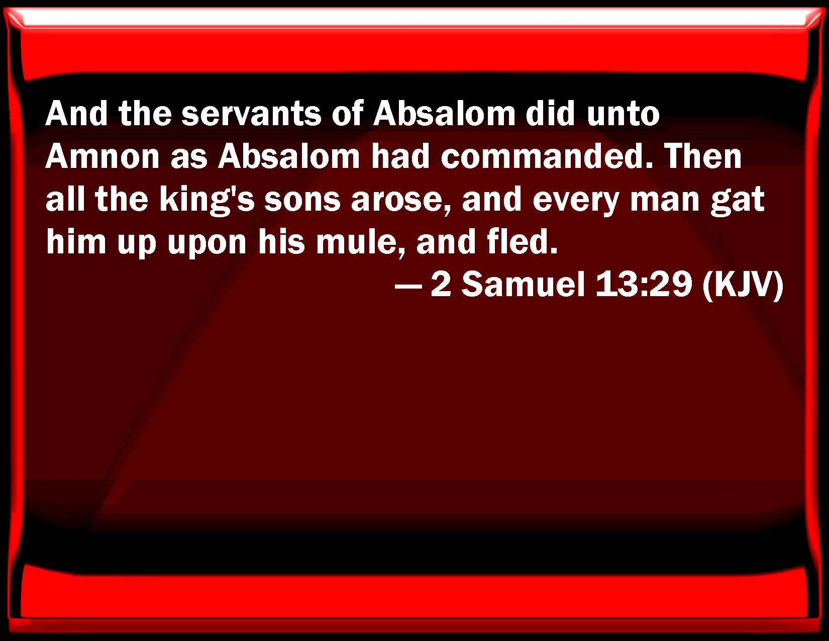 Bible Verse Slide 2 Samuel 13:29 And the servants of Absalom did to Amnon as Absalom had commanded. Then all the king's sons arose, and every man got him up on his mule, and fled. KJV: And the servants of Absalom did unto Amnon as Absalom had commanded. Then all the king's sons arose, and every man gat him up upon his mule, and fled. DRB: And the servants of Absalom did to Amnon as Absalom had commanded them. And all the king's sons arose and got up every man upon his mule, and fled. DBT: And the servants of Absalom did to Amnon as Absalom had commanded. Then all the king's sons arose, and they rode each upon his mule and fled. ERV: And the servants of Absalom did unto Amnon as Absalom had commanded. Then all the king's sons arose, and every man gat him up upon his mule, and fled. WBT: And the servants of Absalom did to Amnon as Absalom had commanded. Then all the king's sons arose, and every man rode upon his mule, and fled. WEB: The servants of Absalom did to Amnon as Absalom had commanded. Then all the king's sons arose, and every man got up on his mule, and fled. YLT: And the young men of Absalom do to Amnon as Absalom commanded, and rise do all the sons of the king, and they ride, each on his mule, and flee.Links 2 Samuel 13:29 NIV • 2 Samuel 13:29 NLT • 2 Samuel 13:29 ESV • 2 Samuel 13:29 NASB • 2 Samuel 13:29 KJV • 2 Samuel 13:29 Interlinear • 2 Samuel 13:29 Commentaries • 2 Samuel 13:29 Parallel Texts • 2 Samuel 13:29 Bible Apps • 2 Samuel 13:29 Parallel • Bible Hub |