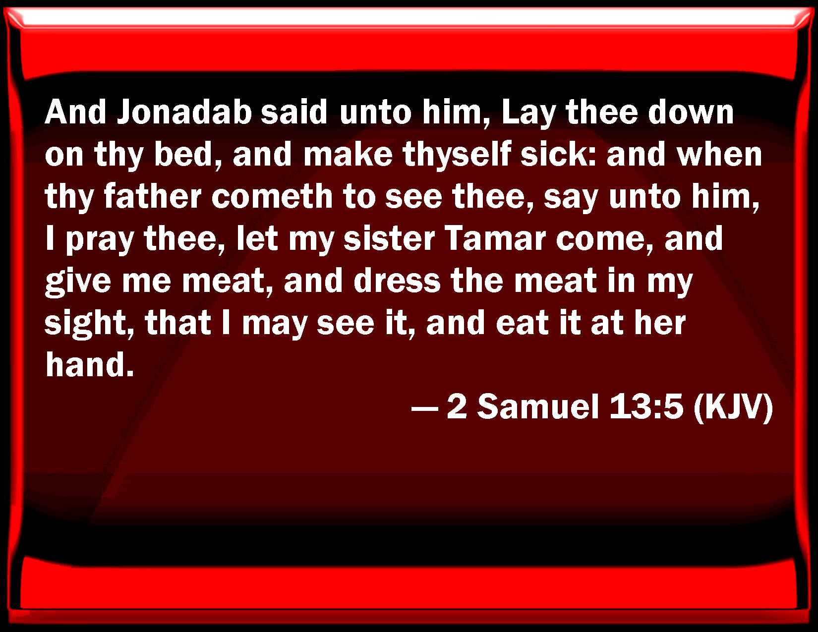 Bible Verse Slide 2 Samuel 13:5 And Jonadab said to him, Lay you down on your bed, and make yourself sick: and when your father comes to see you, say to him, I pray you, let my sister Tamar come, and give me meat, and dress the meat in my sight, that I may see it, and eat it at her hand. KJV: And Jonadab said unto him, Lay thee down on thy bed, and make thyself sick: and when thy father cometh to see thee, say unto him, I pray thee, let my sister Tamar come, and give me meat, and dress the meat in my sight, that I may see it, and eat it at her hand. DRB: And Jonadab said to him: Lie down upon thy bed, and feign thyself sick: and when thy father shall come to visit thee, say to him: Let my sister Thamar, I pray thee, come to me, to give me to eat, and to make me a mess, that I may eat it at her hand. DBT: And Jonadab said to him, Lay thee down on thy bed and feign thyself sick; and when thy father comes to see thee, say to him, I pray thee, let my sister Tamar come, and give me food, and dress the food in my sight, that I may see it, and eat it from her hand. ERV: And Jonadab said unto him, Lay thee down on thy bed, and feign thyself sick: and when thy father cometh to see thee, say unto him, Let my sister Tamar come, I pray thee, and give me bread to eat, and dress the food in my sight, that I may see it, and eat it at her hand. WBT: And Jonadab said to him, Lay thee down on thy bed, and make thyself sick: and when thy father cometh to see thee, say to him, I pray thee, let my sister Tamar come, and give me food, and dress the food in my sight, that I may see it, and eat it at her hand. WEB: Jonadab said to him, "Lay down on your bed, and pretend to be sick. When your father comes to see you, tell him, 'Please let my sister Tamar come and give me bread to eat, and dress the food in my sight, that I may see it, and eat it from her hand.'" YLT: And Jonadab saith to him, 'Lie down on thy couch, and feign thyself sick, and thy father hath come in to see thee, and thou hast said unto him, 'Let, I pray thee, Tamar my sister come in and give me bread to eat; and she hath made the food before mine eyes so that I see it, and have eaten from her hand.'Links 2 Samuel 13:5 NIV • 2 Samuel 13:5 NLT • 2 Samuel 13:5 ESV • 2 Samuel 13:5 NASB • 2 Samuel 13:5 KJV • 2 Samuel 13:5 Interlinear • 2 Samuel 13:5 Commentaries • 2 Samuel 13:5 Parallel Texts • 2 Samuel 13:5 Bible Apps • 2 Samuel 13:5 Parallel • Bible Hub |