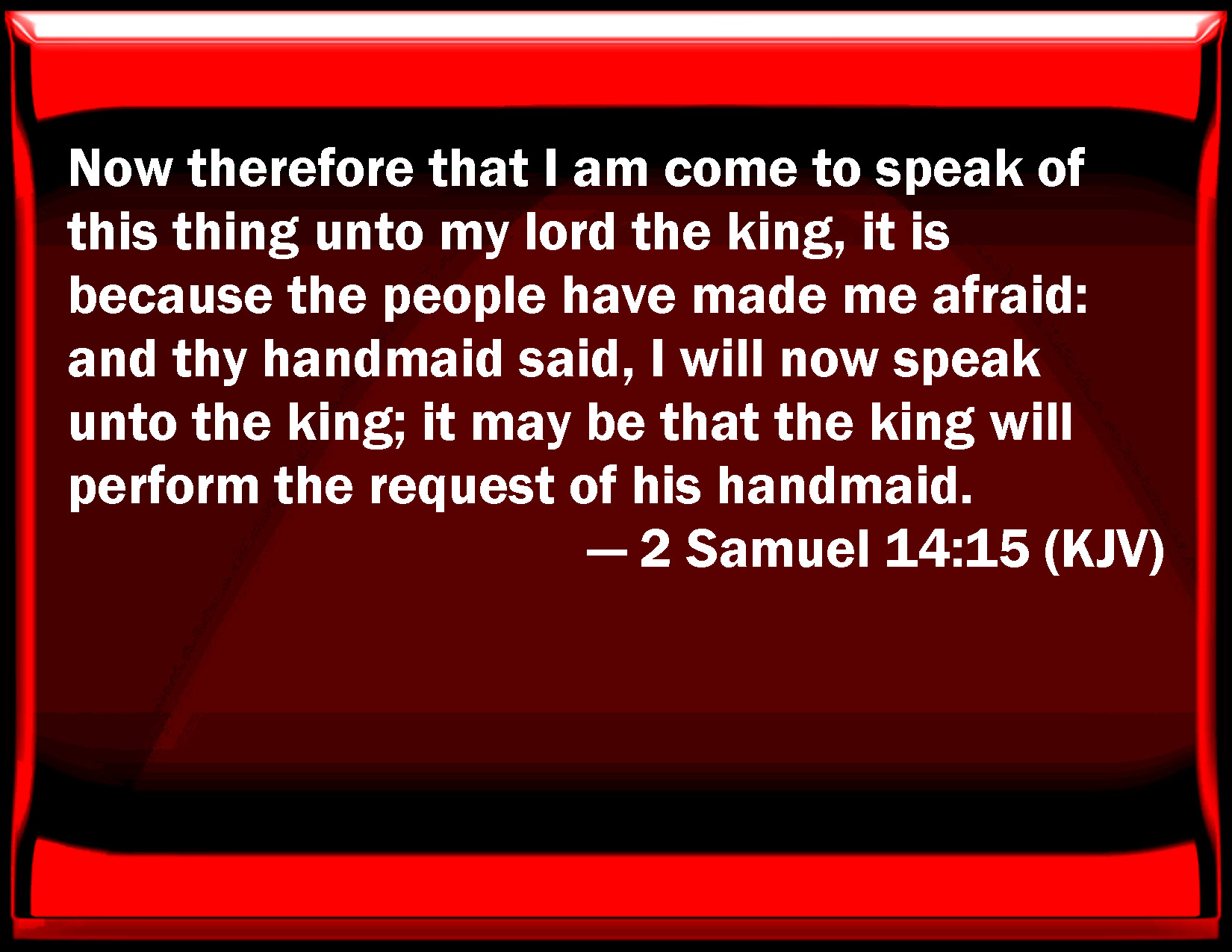Bible Verse Slide 2 Samuel 14:15 Now therefore that I am come to speak of this thing to my lord the king, it is because the people have made me afraid: and your handmaid said, I will now speak to the king; it may be that the king will perform the request of his handmaid. KJV: Now therefore that I am come to speak of this thing unto my lord the king, it is because the people have made me afraid: and thy handmaid said, I will now speak unto the king; it may be that the king will perform the request of his handmaid. DRB: Now therefore I am come, to speak this word to my lord the king before the people. And thy handmaid said: I will speak to the king, it maybe the king will perform the request of his handmaid. DBT: And now that I am come to speak of this thing to my lord the king, it is because the people have made me afraid; and thy bondmaid said, I will now speak to the king; perhaps the king will perform the request of his handmaid. ERV: Now therefore seeing that I am come to speak this word unto my lord the king, it is because the people have made me afraid: and thy handmaid said, I will now speak unto the king; it may be that the king will perform the request of his servant. WBT: Now therefore that I have come to speak of this thing to my lord the king, it is because the people have made me afraid: and thy handmaid said, I will now speak to the king; it may be that the king will perform the request of his handmaid. WEB: Now therefore seeing that I have come to speak this word to my lord the king, it is because the people have made me afraid: and your handmaid said, 'I will now speak to the king; it may be that the king will perform the request of his servant.' YLT: And now that I have come to speak unto the king my lord this word, it is because the people made me afraid, and thy maid-servant saith, Let me speak, I pray thee, unto the king; it may be the king doth do the word of his handmaid,Links 2 Samuel 14:15 NIV • 2 Samuel 14:15 NLT • 2 Samuel 14:15 ESV • 2 Samuel 14:15 NASB • 2 Samuel 14:15 KJV • 2 Samuel 14:15 Interlinear • 2 Samuel 14:15 Commentaries • 2 Samuel 14:15 Parallel Texts • 2 Samuel 14:15 Bible Apps • 2 Samuel 14:15 Parallel • Bible Hub |