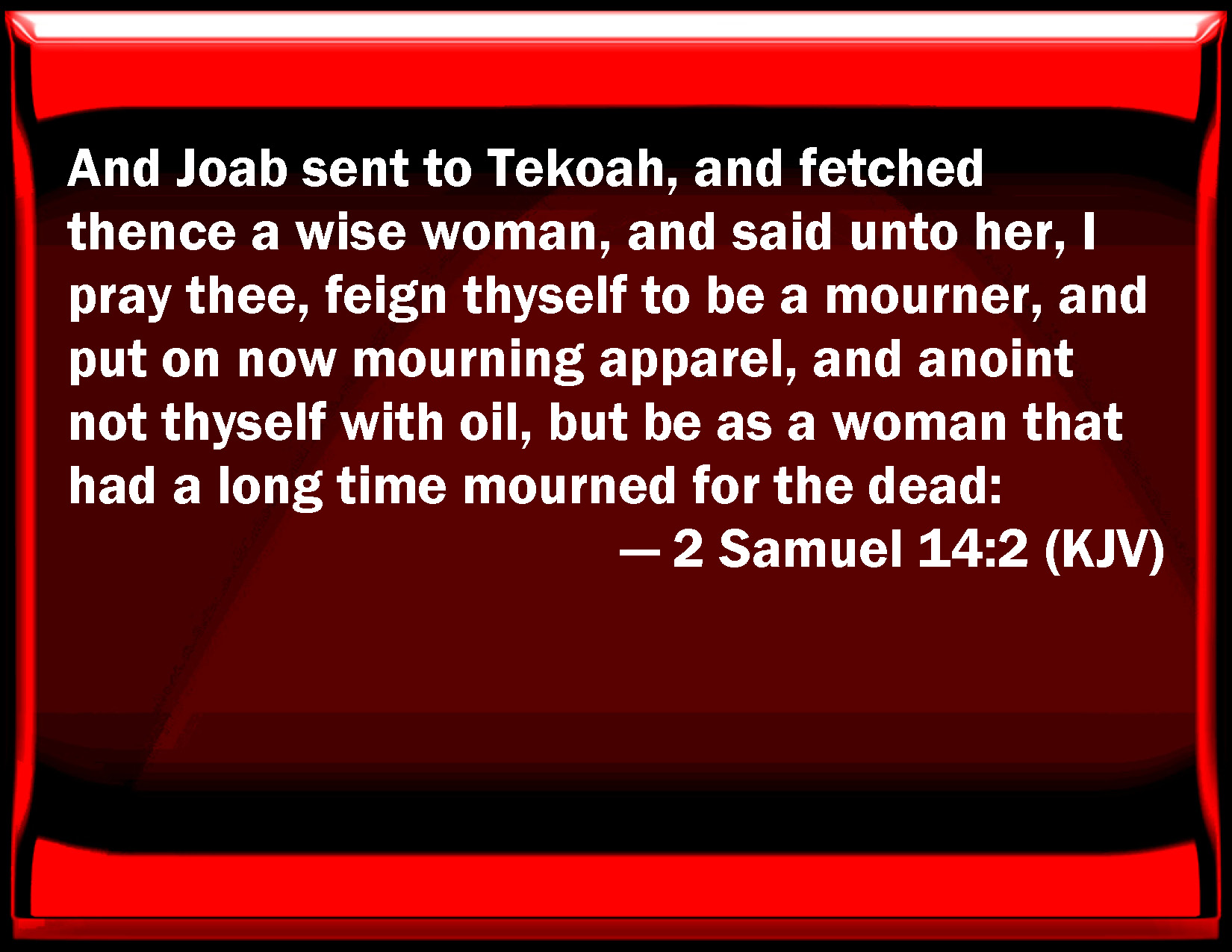 Bible Verse Slide 2 Samuel 14:2 And Joab sent to Tekoah, and fetched there a wise woman, and said to her, I pray you, feign yourself to be a mourner, and put on now mourning apparel, and anoint not yourself with oil, but be as a woman that had a long time mourned for the dead: KJV: And Joab sent to Tekoah, and fetched thence a wise woman, and said unto her, I pray thee, feign thyself to be a mourner, and put on now mourning apparel, and anoint not thyself with oil, but be as a woman that had a long time mourned for the dead: DRB: Sent to Thecua, and fetched from thence a wise woman: and said to her: Feign thyself to be a mourner, and put on mourning apparel, and be not anointed with oil, that thou mayest be as a woman that had a long time been mourning for one dead. DBT: And Joab sent to Tekoah, and fetched thence a wise woman, and said to her, I pray thee, feign thyself to be a mourner, and put on mourning garments, I pray, and anoint not thyself with oil, but be as a woman that hath a long time mourned for the dead; ERV: And Joab sent to Tekoa, and fetched thence a wise woman, and said unto her, I pray thee, feign thyself to be a mourner, and put on mourning apparel, I pray thee, and anoint not thyself with oil, but be as a woman that had a long time mourned for the dead: WBT: And Joab sent to Tekoah, and brought thence a wise woman, and said to her, I pray thee, feign thyself to be a mourner, and put on now mourning apparel, and anoint not thyself with oil, but be as a woman that had a long time mourned for the dead: WEB: Joab sent to Tekoa, and fetched there a wise woman, and said to her, "Please act like a mourner, and put on mourning clothing, please, and don't anoint yourself with oil, but be as a woman who has mourned a long time for the dead. YLT: and Joab sendeth to Tekoah, and taketh thence a wise woman, and saith unto her, 'Feign thyself a mourner, I pray thee, and put on, I pray thee, garments of mourning, and anoint not thyself with oil, and thou hast been as a woman these many days mourning for the dead,Links 2 Samuel 14:2 NIV • 2 Samuel 14:2 NLT • 2 Samuel 14:2 ESV • 2 Samuel 14:2 NASB • 2 Samuel 14:2 KJV • 2 Samuel 14:2 Interlinear • 2 Samuel 14:2 Commentaries • 2 Samuel 14:2 Parallel Texts • 2 Samuel 14:2 Bible Apps • 2 Samuel 14:2 Parallel • Bible Hub |