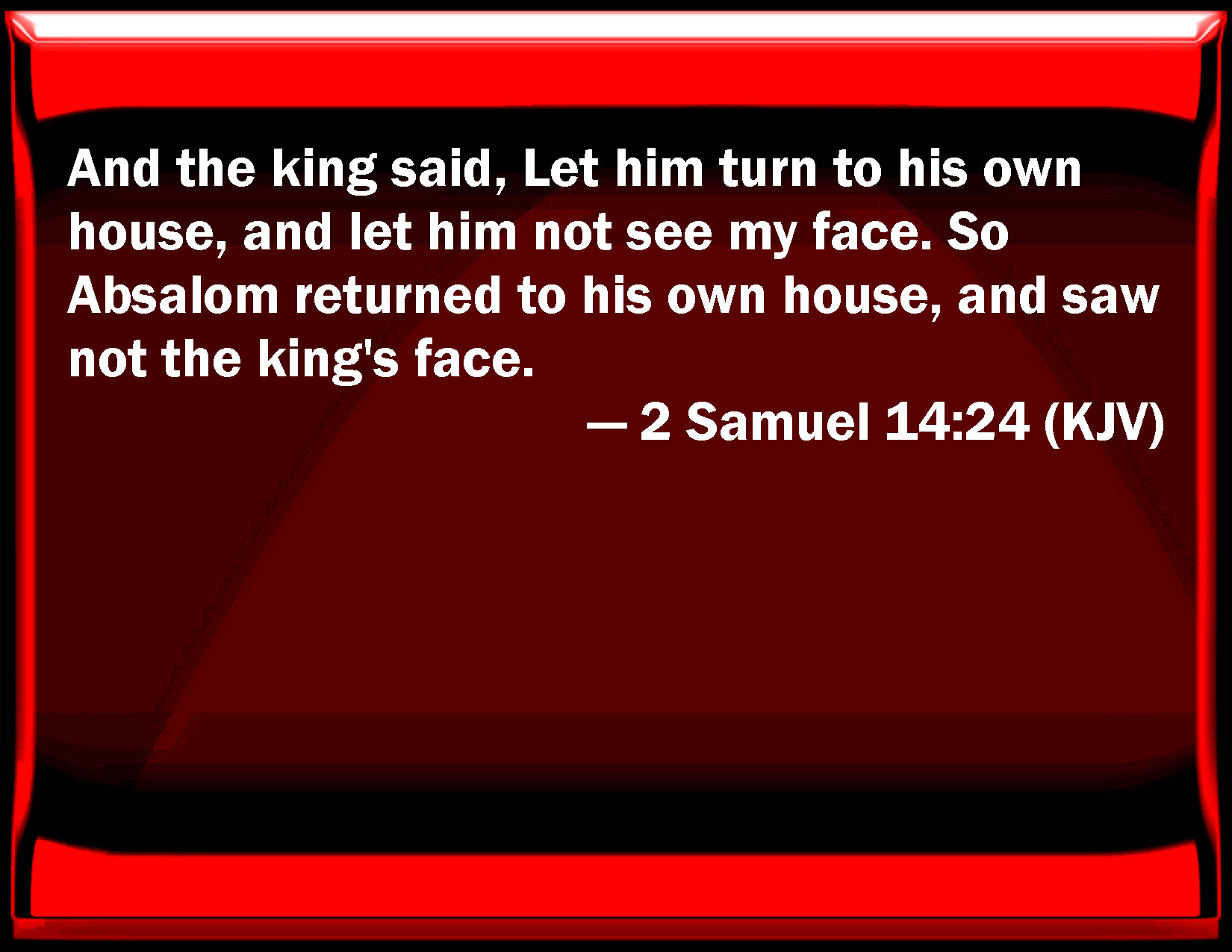 Bible Verse Slide 2 Samuel 14:24 And the king said, Let him turn to his own house, and let him not see my face. So Absalom returned to his own house, and saw not the king's face. KJV: And the king said, Let him turn to his own house, and let him not see my face. So Absalom returned to his own house, and saw not the king's face. DRB: But the king said: Let him return into his house, and let him not see my face. So Absalom returned into his house, and saw not the king's face. DBT: And the king said, Let him turn to his own house, and let him not see my face. And Absalom withdrew to his own house, and saw not the king's face. ERV: And the king said, Let him turn to his own house, but let him not see my face. So Absalom turned to his own house, and saw not the king's face. WBT: And the king said, Let him turn to his own house, and let him not see my face. So Absalom returned to his own house, and saw not the king's face. WEB: The king said, "Let him return to his own house, but let him not see my face." So Absalom returned to his own house, and didn't see the king's face. YLT: and the king saith, 'Let him turn round unto his house, and my face he doth not see.' And Absalom turneth round unto his house, and the face of the king he hath not seen.Links 2 Samuel 14:24 NIV • 2 Samuel 14:24 NLT • 2 Samuel 14:24 ESV • 2 Samuel 14:24 NASB • 2 Samuel 14:24 KJV • 2 Samuel 14:24 Interlinear • 2 Samuel 14:24 Commentaries • 2 Samuel 14:24 Parallel Texts • 2 Samuel 14:24 Bible Apps • 2 Samuel 14:24 Parallel • Bible Hub |
