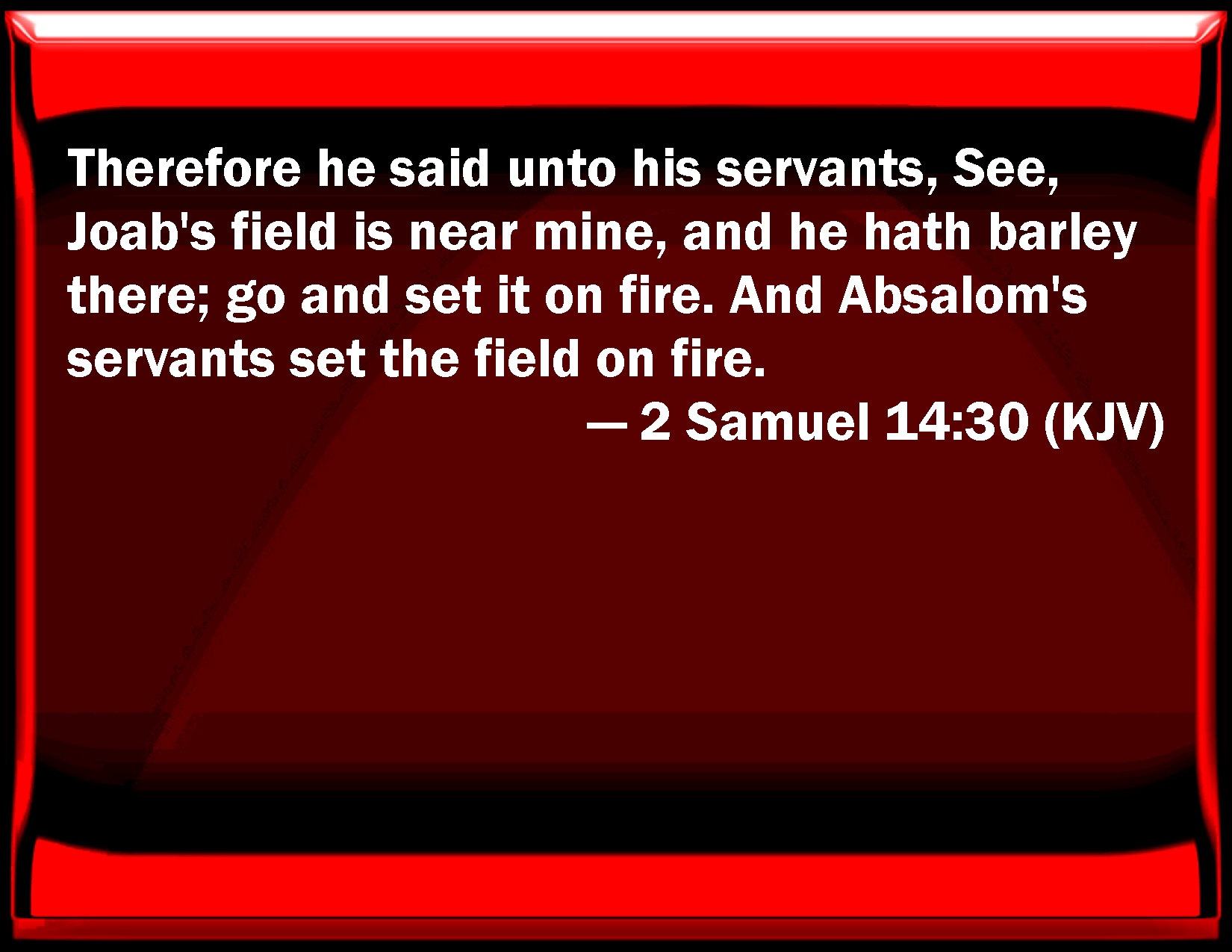 Bible Verse Slide 2 Samuel 14:30 Therefore he said to his servants, See, Joab's field is near mine, and he has barley there; go and set it on fire. And Absalom's servants set the field on fire. KJV: Therefore he said unto his servants, See, Joab's field is near mine, and he hath barley there; go and set it on fire. And Absalom's servants set the field on fire. DRB: He said to his servants: You know the field of Joab near my field, that hath a crop of barley: go now and set it on fire. So the servants of Absalom set the corn on fire. And Joab's servants coming with their garments rent, said: The servants of Absalom have set part of the field on fire. DBT: Then he said to his servants, See, Joab's allotment is near mine and he has barley there: go and set it on fire. And Absalom's servants set the allotment on fire. ERV: Therefore he said unto his servants, See, Joab's field is near mine, and he hath barley there; go and set it on fire. And Absalom's servants set the field on fire. WBT: Therefore he said to his servants, See, Joab's field is near mine, and he hath barley there; go and set it on fire. And Absalom's servants set the field on fire. WEB: Therefore he said to his servants, "Behold, Joab's field is near mine, and he has barley there. Go and set it on fire." Absalom's servants set the field on fire. YLT: And he saith unto his servants, 'See, the portion of Joab is by the side of mine, and he hath barley there; go, and burn it with fire;' and the servants of Absalom burn the portion with fire.Links 2 Samuel 14:30 NIV • 2 Samuel 14:30 NLT • 2 Samuel 14:30 ESV • 2 Samuel 14:30 NASB • 2 Samuel 14:30 KJV • 2 Samuel 14:30 Interlinear • 2 Samuel 14:30 Commentaries • 2 Samuel 14:30 Parallel Texts • 2 Samuel 14:30 Bible Apps • 2 Samuel 14:30 Parallel • Bible Hub |