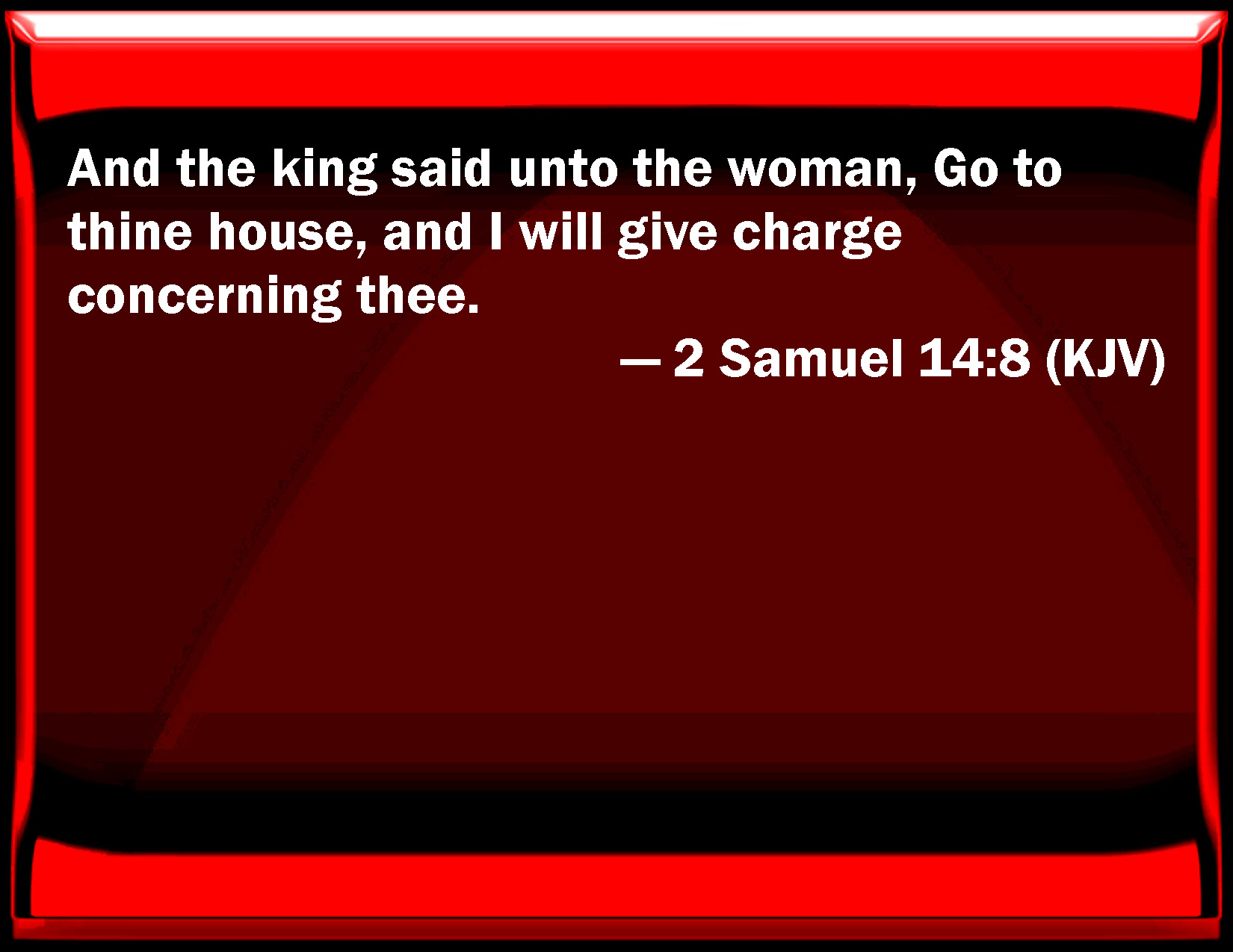 Bible Verse Slide 2 Samuel 14:8 And the king said to the woman, Go to your house, and I will give charge concerning you. KJV: And the king said unto the woman, Go to thine house, and I will give charge concerning thee. DRB: And the king said to the woman: Go to thy house, and I will give charge concerning thee. DBT: And the king said to the woman, Go to thy house, and I will give charge concerning thee. ERV: And the king said unto the woman, Go to thine house, and I will give charge concerning thee. WBT: And the king said to the woman, Go to thy house, and I will give charge concerning thee. WEB: The king said to the woman, "Go to your house, and I will give a command concerning you." YLT: And the king saith unto the woman, 'Go to thine house, and I give charge concerning thee.'Links 2 Samuel 14:8 NIV • 2 Samuel 14:8 NLT • 2 Samuel 14:8 ESV • 2 Samuel 14:8 NASB • 2 Samuel 14:8 KJV • 2 Samuel 14:8 Interlinear • 2 Samuel 14:8 Commentaries • 2 Samuel 14:8 Parallel Texts • 2 Samuel 14:8 Bible Apps • 2 Samuel 14:8 Parallel • Bible Hub |