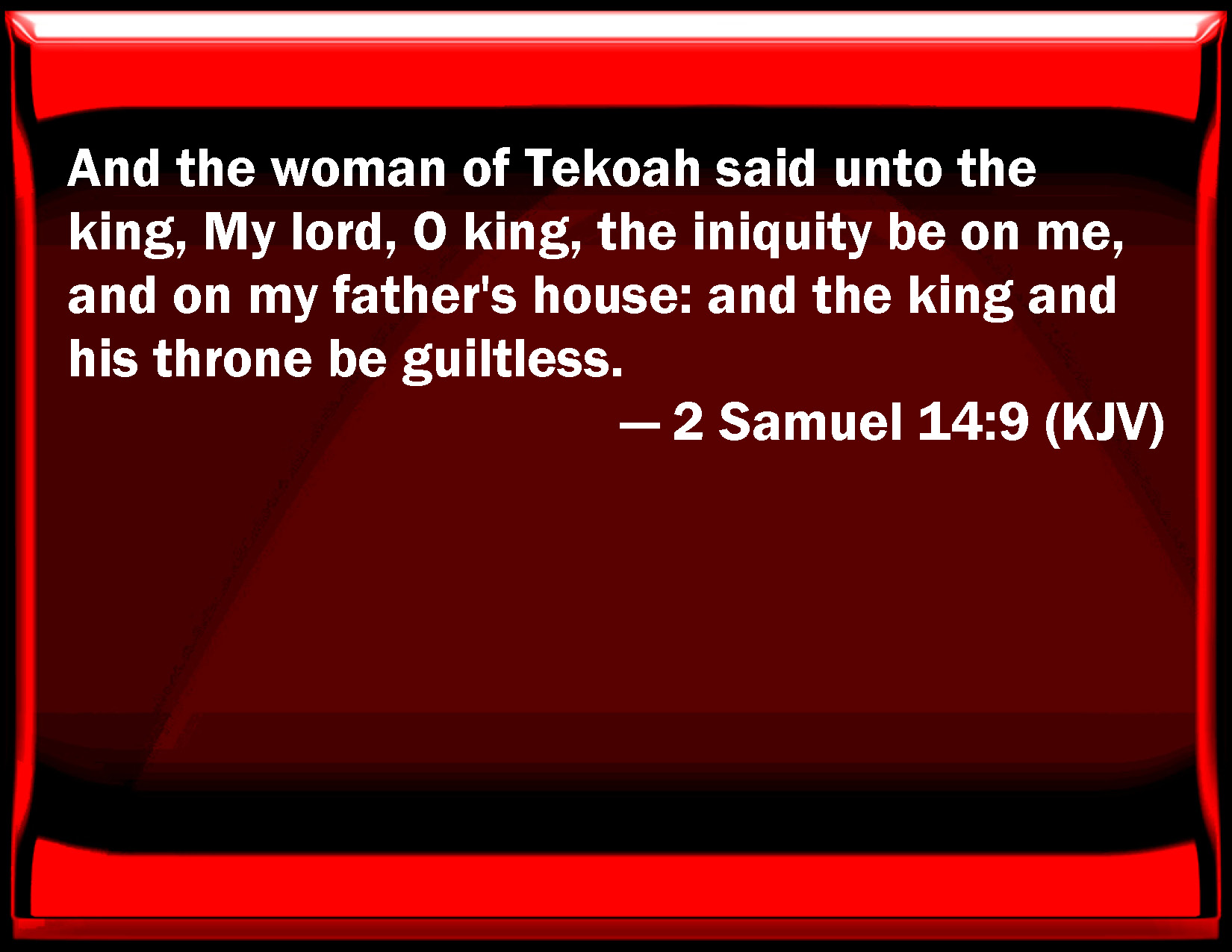 Bible Verse Slide 2 Samuel 14:9 And the woman of Tekoah said to the king, My lord, O king, the iniquity be on me, and on my father's house: and the king and his throne be guiltless. KJV: And the woman of Tekoah said unto the king, My lord, O king, the iniquity be on me, and on my father's house: and the king and his throne be guiltless. DRB: And the woman of Thecua said to the king: Upon me, my lord, be the iniquity, and upon the house of my father: but may the king and his throne be guiltless. DBT: And the woman of Tekoah said to the king, Upon me, my lord, O king, be the iniquity, and upon my father's house; and the king and his throne be guiltless. ERV: And the woman of Tekoa said unto the king, My lord, O king, the iniquity be on me, and on my father's house: and the king and his throne be guiltless. WBT: And the woman of Tekoah said to the king, My lord, O king, the iniquity be on me, and on my father's house: and the king and his throne be guiltless. WEB: The woman of Tekoa said to the king, "My lord, O king, the iniquity be on me, and on my father's house; and the king and his throne be guiltless." YLT: And the woman of Tekoah saith unto the king, 'On me, my lord, O king, is the iniquity, and on the house of my father; and the king and his throne are innocent.'Links 2 Samuel 14:9 NIV • 2 Samuel 14:9 NLT • 2 Samuel 14:9 ESV • 2 Samuel 14:9 NASB • 2 Samuel 14:9 KJV • 2 Samuel 14:9 Interlinear • 2 Samuel 14:9 Commentaries • 2 Samuel 14:9 Parallel Texts • 2 Samuel 14:9 Bible Apps • 2 Samuel 14:9 Parallel • Bible Hub |