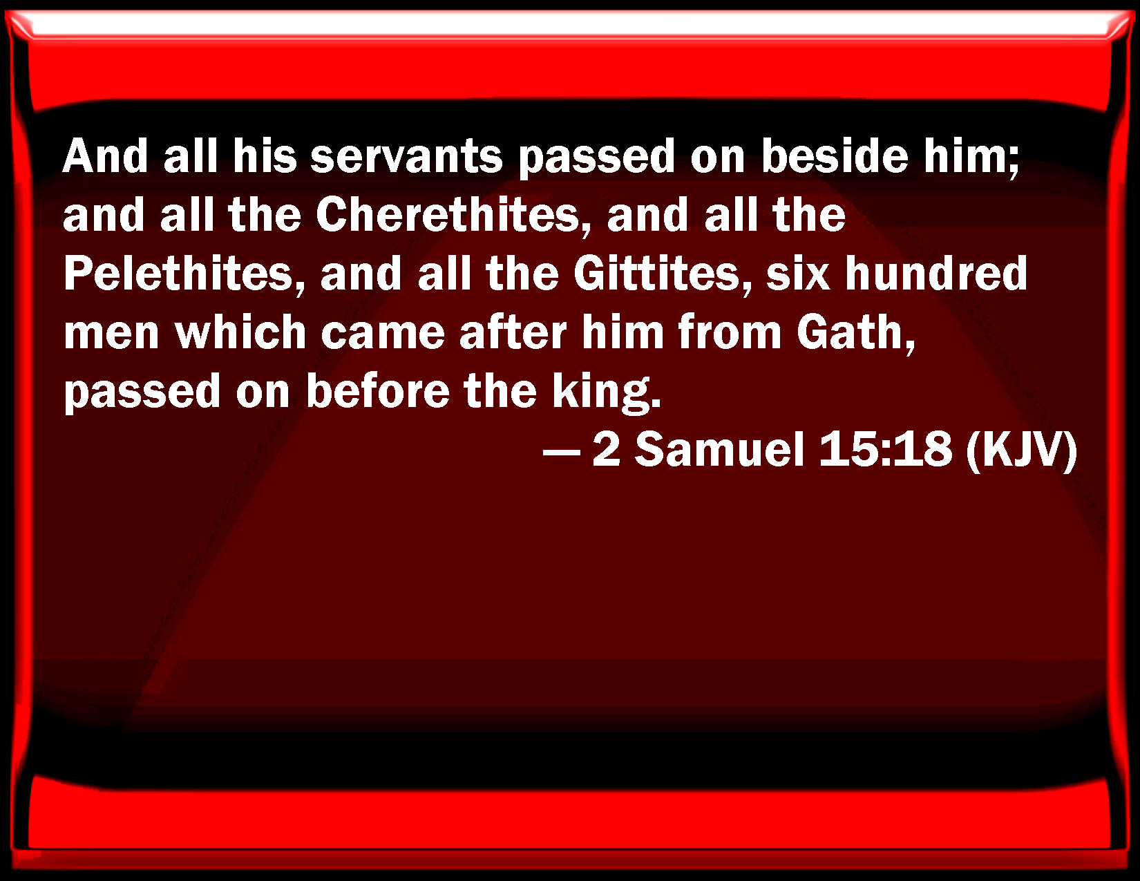 Bible Verse Slide 2 Samuel 15:18 And all his servants passed on beside him; and all the Cherethites, and all the Pelethites, and all the Gittites, six hundred men which came after him from Gath, passed on before the king. KJV: And all his servants passed on beside him; and all the Cherethites, and all the Pelethites, and all the Gittites, six hundred men which came after him from Gath, passed on before the king. DRB: And all his servants walked by him, and the bands of the Cerethi, and the Phelethi, and all the Gethites, valiant warriors, six hundred men who had followed him from Geth on foot, went before the king. DBT: And all his servants passed on beside him; and all the Cherethites, and all the Pelethites, and all the Gittites, six hundred men that came after him from Gath, passed over before the king. ERV: And all his servants passed on beside him; and all the Cherethites, and all the Pelethites, and all the Gittites, six hundred men which came after him from Gath, passed on before the king. WBT: And all his servants passed on by his side; and all the Cherethites, and all the Pelethites, and all the Gittites, six hundred men who came after him from Gath, passed on before the king. WEB: All his servants passed on beside him; and all the Cherethites, and all the Pelethites, and all the Gittites, six hundred men who came after him from Gath, passed on before the king. YLT: And all his servants are passing on at his side, and all the Cherethite, and all the Pelethite, and all the Gittites, six hundred men who came at his feet from Gath, are passing on at the front of the king.Links 2 Samuel 15:18 NIV • 2 Samuel 15:18 NLT • 2 Samuel 15:18 ESV • 2 Samuel 15:18 NASB • 2 Samuel 15:18 KJV • 2 Samuel 15:18 Interlinear • 2 Samuel 15:18 Commentaries • 2 Samuel 15:18 Parallel Texts • 2 Samuel 15:18 Bible Apps • 2 Samuel 15:18 Parallel • Bible Hub |