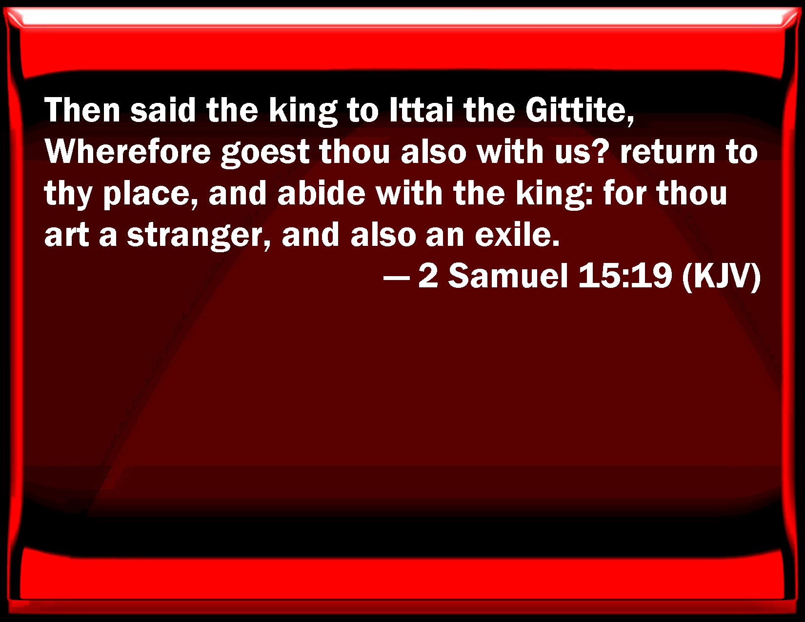 Bible Verse Slide 2 Samuel 15:19 Then said the king to Ittai the Gittite, Why go you also with us? return to your place, and abide with the king: for you are a stranger, and also an exile. KJV: Then said the king to Ittai the Gittite, Wherefore goest thou also with us? return to thy place, and abide with the king: for thou art a stranger, and also an exile. DRB: And the king said to Ethai the Gethite: Why comest thou with us? return and dwell with the king, for thou art a stranger, and art come out of thy own place. DBT: And the king said to Ittai the Gittite, Why dost thou also go with us? return to thy place, and abide with the king; for thou art a foreigner, and besides, thou hast emigrated to the place where thou dwellest. ERV: Then said the king to Ittai the Gittite, Wherefore goest thou also with us? return, and abide with the king: for thou art a stranger, and also an exile; return to thine own place. WBT: Then said the king to Ittai the Gittite, Why goest thou also with us? return to thy place, and abide with the king; for thou art a stranger, and also an exile. WEB: Then the king said to Ittai the Gittite, "Why do you also go with us? Return, and stay with the king; for you are a foreigner, and also an exile. Return to your own place. YLT: And the king saith unto Ittai the Gittite, 'Why dost thou go — thou also — with us? turn back — and abide with the king, for thou art a stranger, and also an exile thou — to thy place.Links 2 Samuel 15:19 NIV • 2 Samuel 15:19 NLT • 2 Samuel 15:19 ESV • 2 Samuel 15:19 NASB • 2 Samuel 15:19 KJV • 2 Samuel 15:19 Interlinear • 2 Samuel 15:19 Commentaries • 2 Samuel 15:19 Parallel Texts • 2 Samuel 15:19 Bible Apps • 2 Samuel 15:19 Parallel • Bible Hub |
